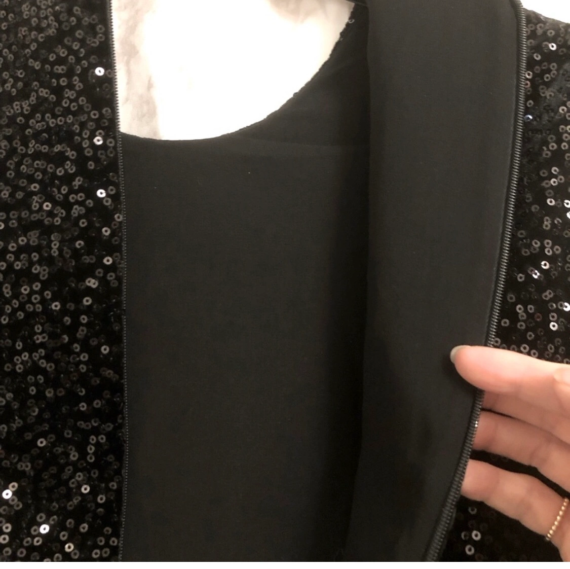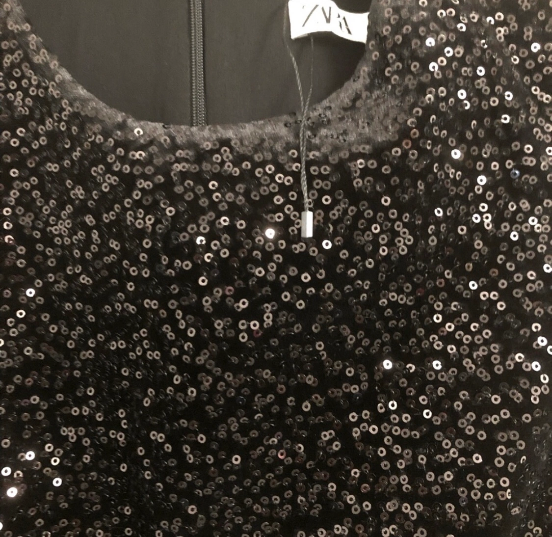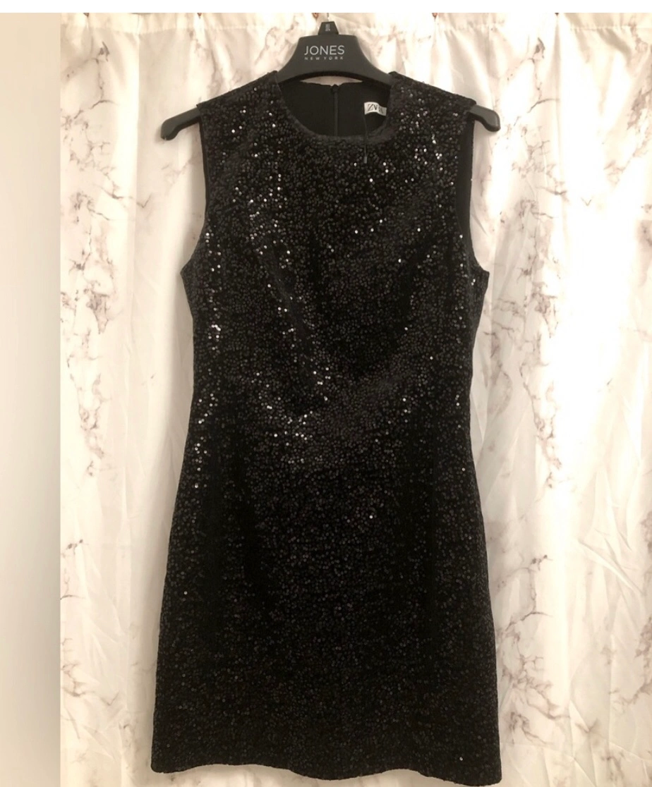 Black mini dress with sequin detailing. Great for any event Sleeveless with round neckline. New