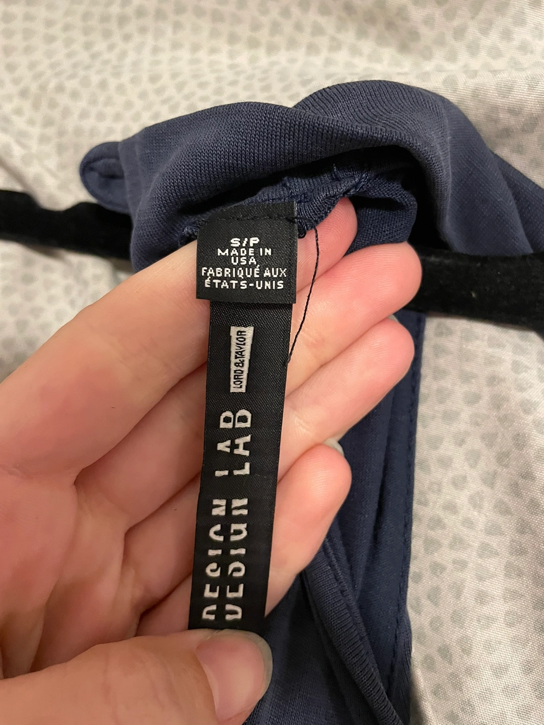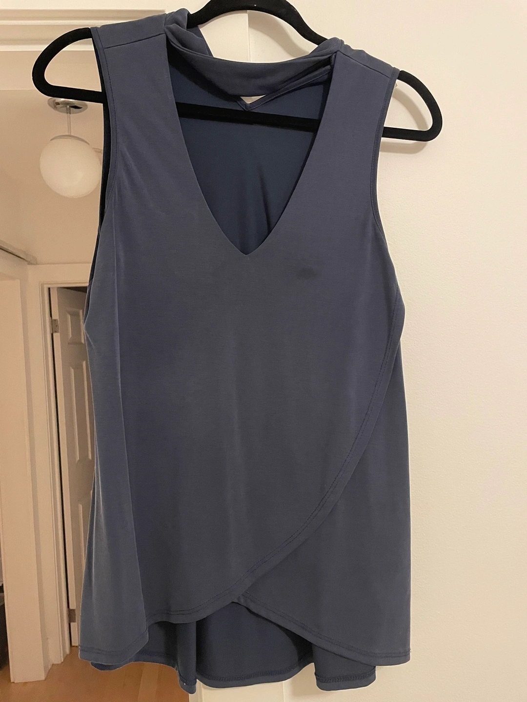 Navy blue sleeveless top with a v- neckline. Made in the USA. Great for everyday wear. Has a small stain on left hand side. Cash only please and pick up at keele subway station