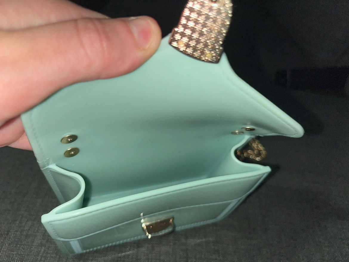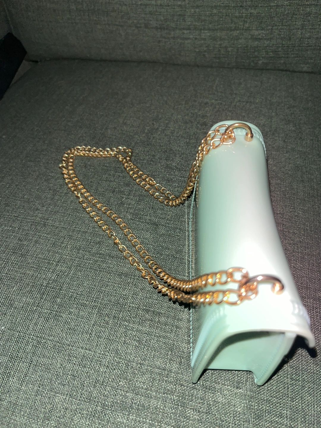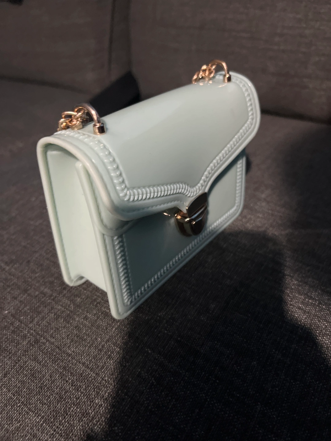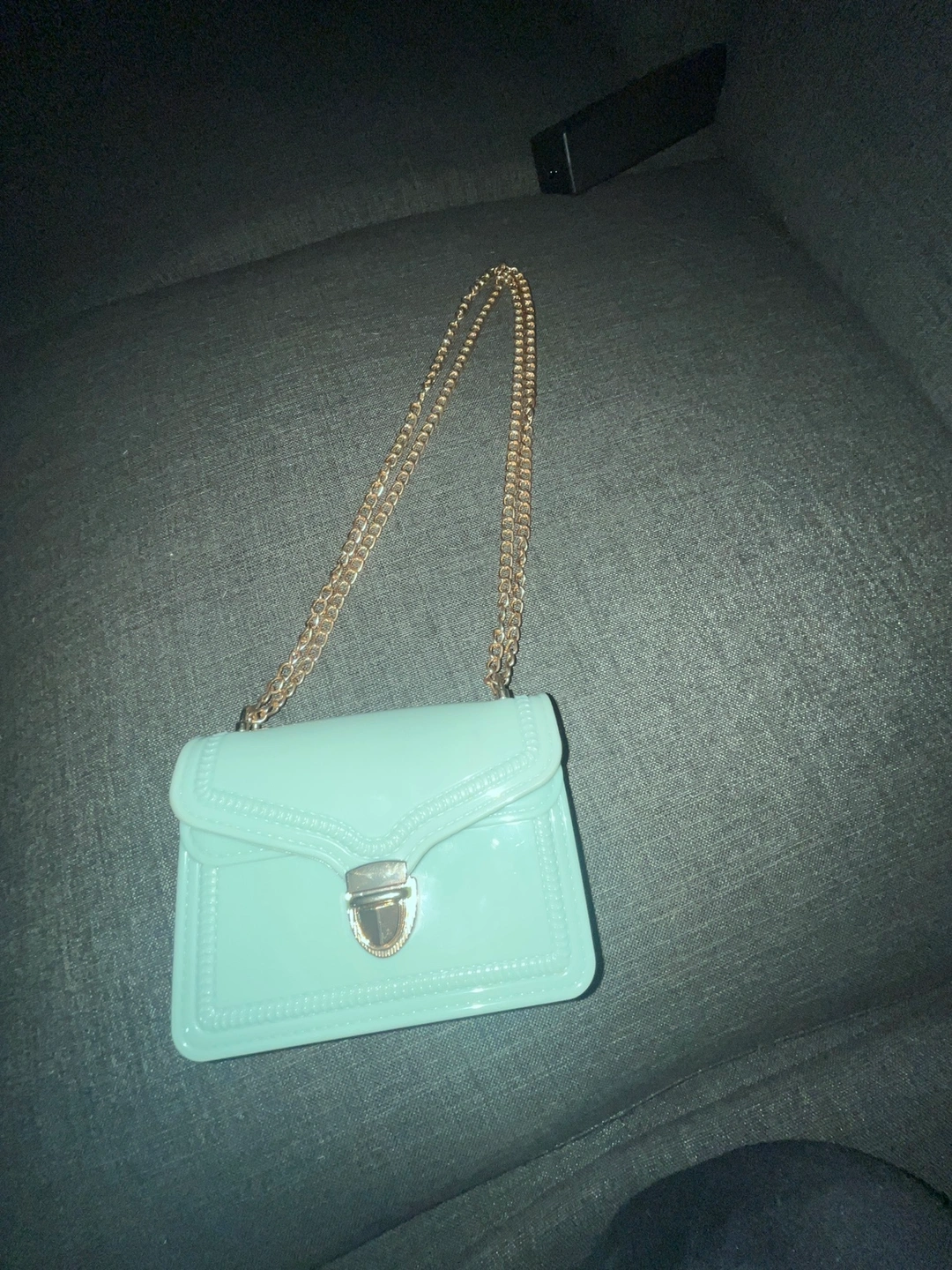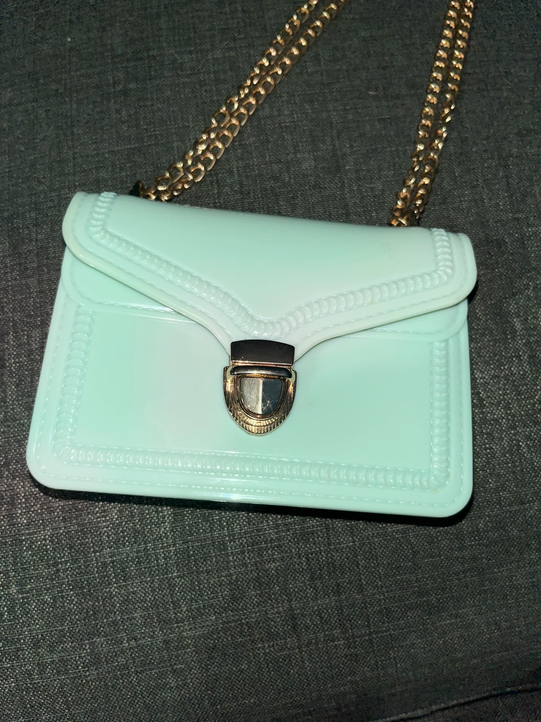 Mint green chain bag with gold hardware. Small and compact.