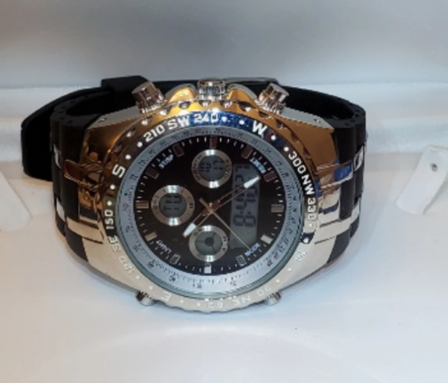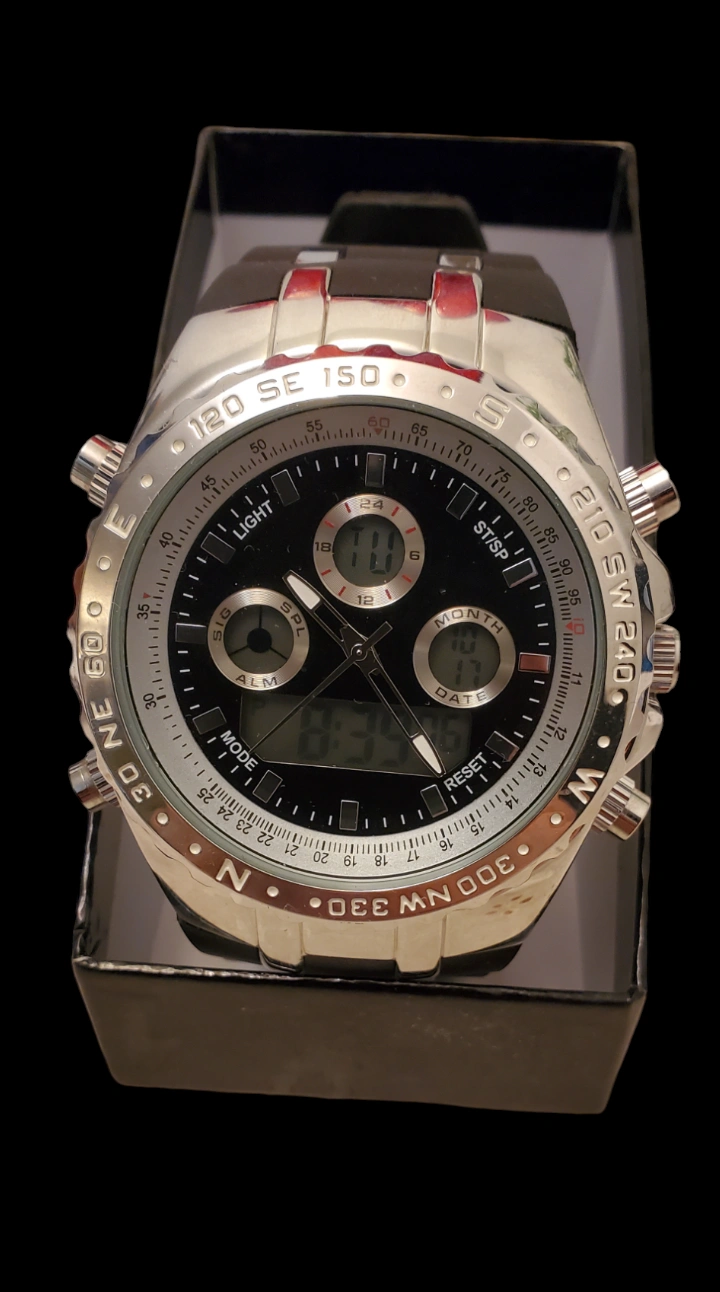 Men's chronograph watch with black face, silver accents, and a black rubber band. Features a date, month, and alarm function.