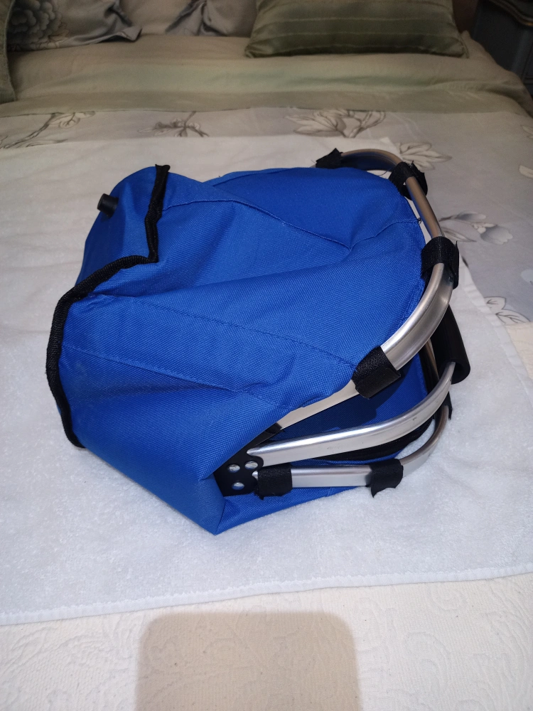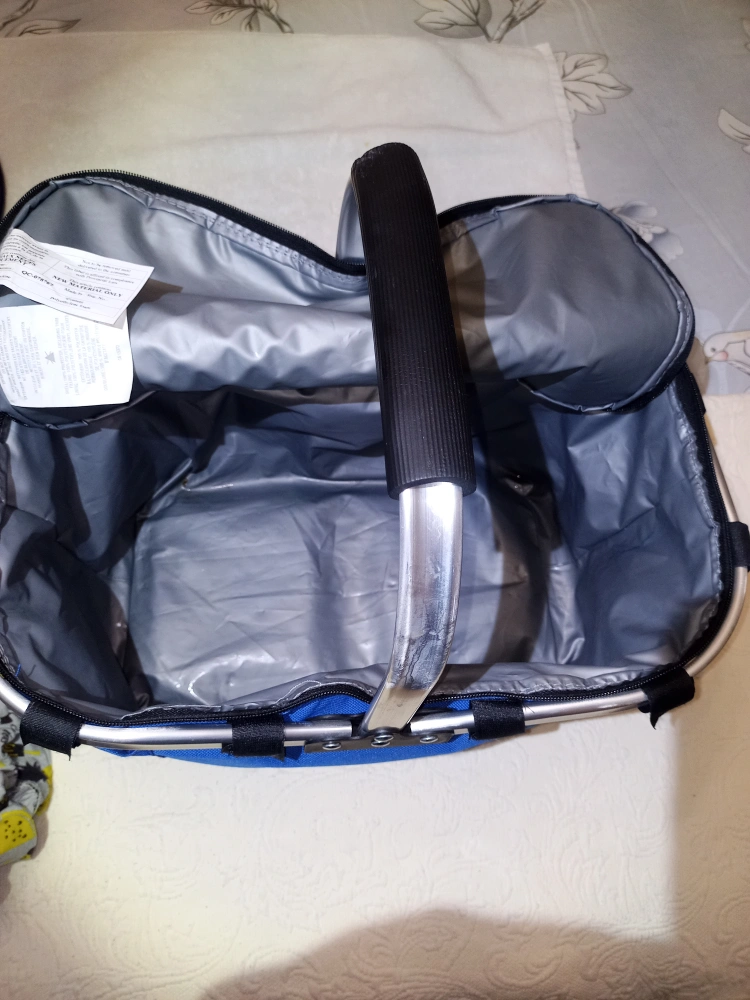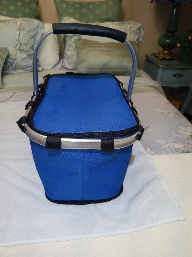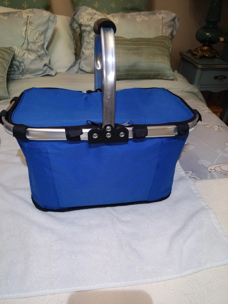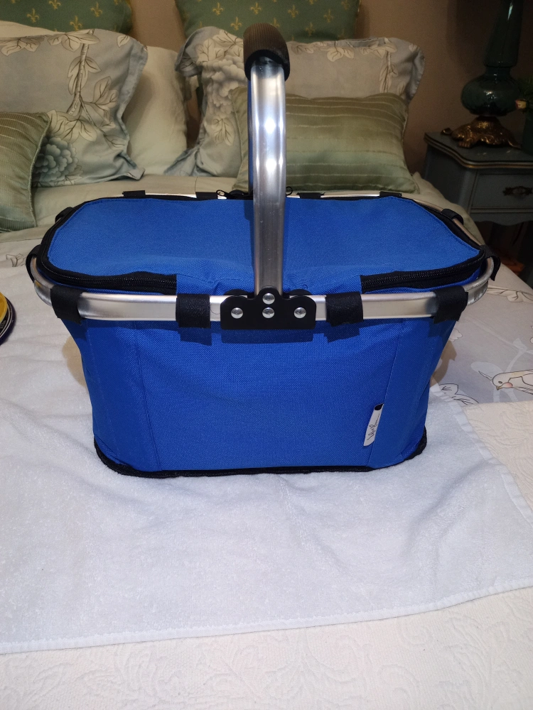 In very good condition. Clean. Zippers work. Thermal travel collapsible aluminum frame picnic basket cooler bag. Measurements are: 16" 3/4 inches in Width 9" 1/2 inches in Height 10" 1/2 inches in Depth. See all pictures provided.