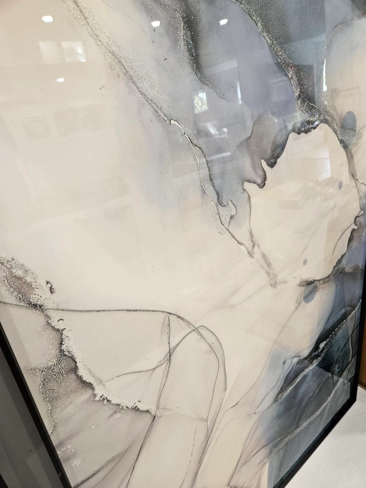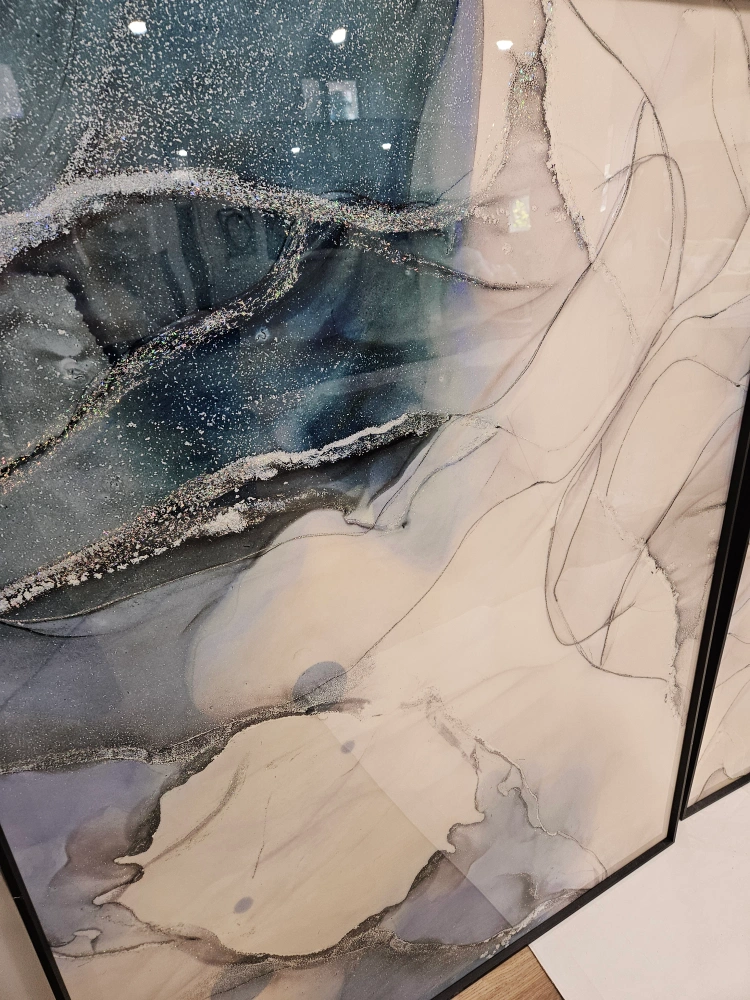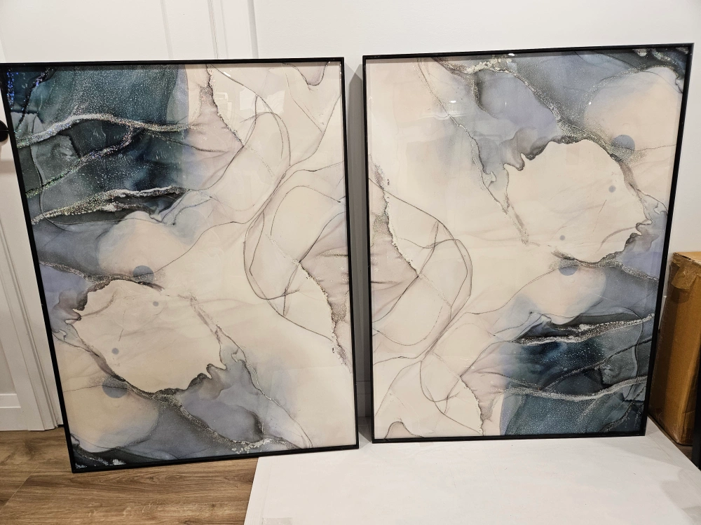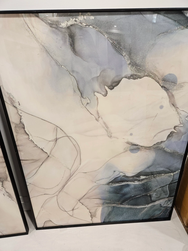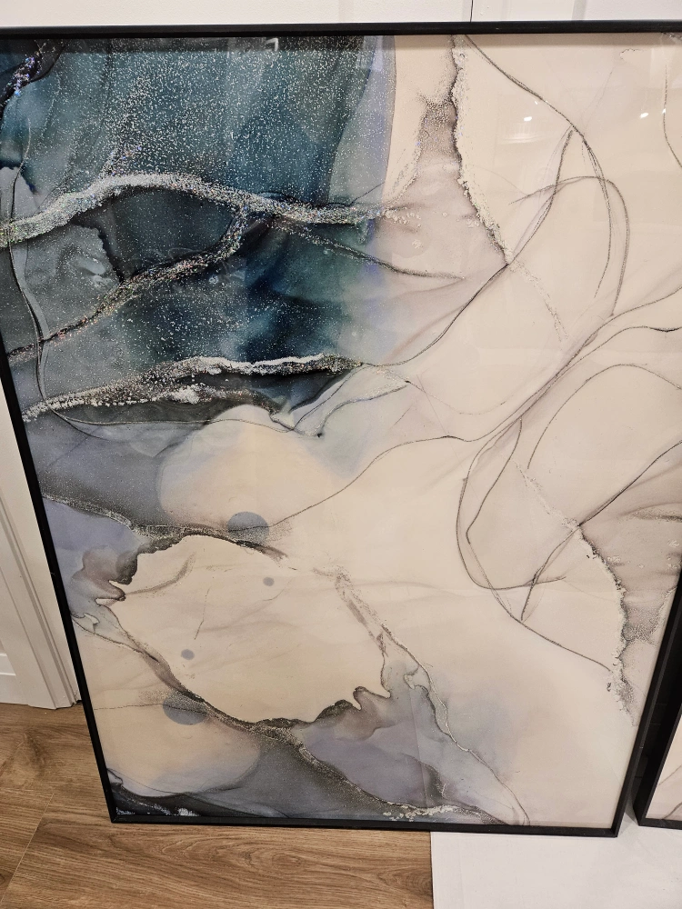 Two framed abstract paintings with a blue, white, and grey colour scheme. Black frames. Two resin art Blue/ black/white Silver sparkle 47.5 x35.5 inch each art 50$each Two for 80$ Check my other ad more decor