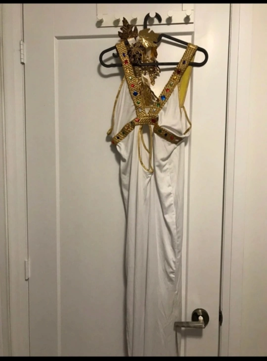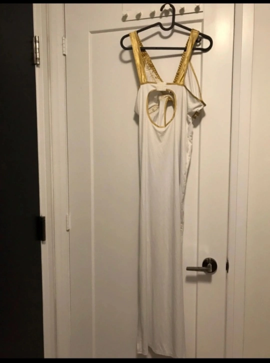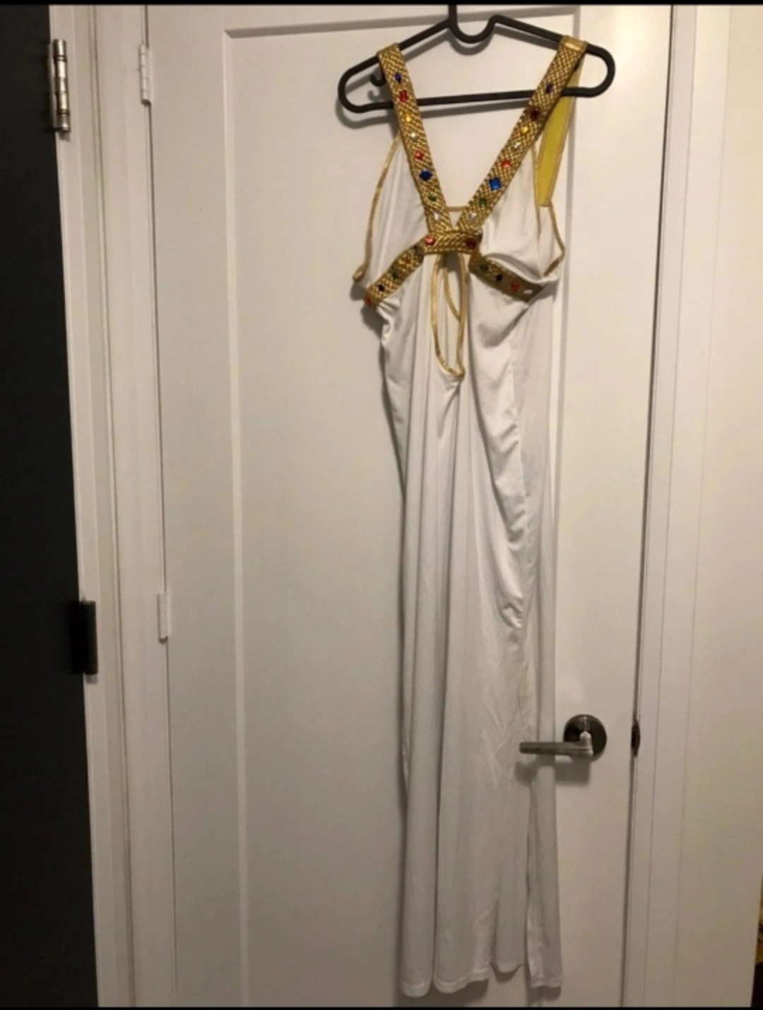 GREEK GODDESS WHITE & GOLD ADULT HALLOWEEN COSTUME WOMEN'S SIZE MEDIUM/LARGE Perfect Costume for your Next Halloween Event! Material Content: 95% Polyester 5% Spandex Cash only