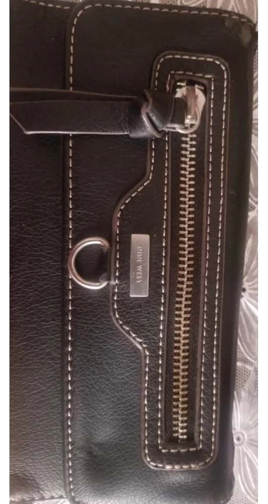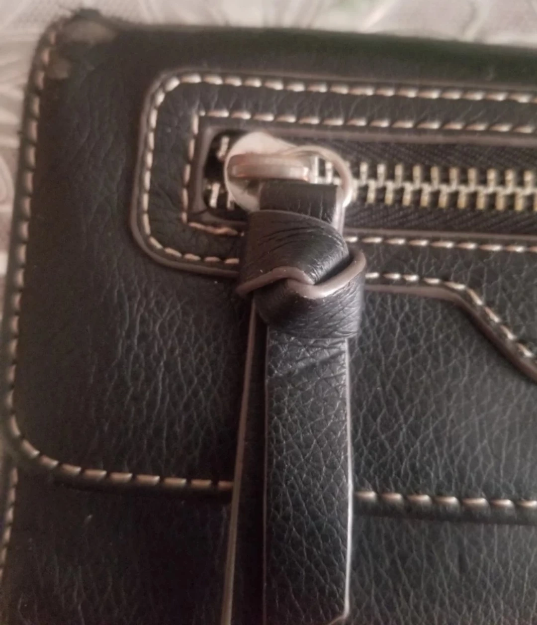 Black leather wallet with a zipper closure and a snap button. It features a window for ID and numerous card slots. scratch on one corner as seen in the pic