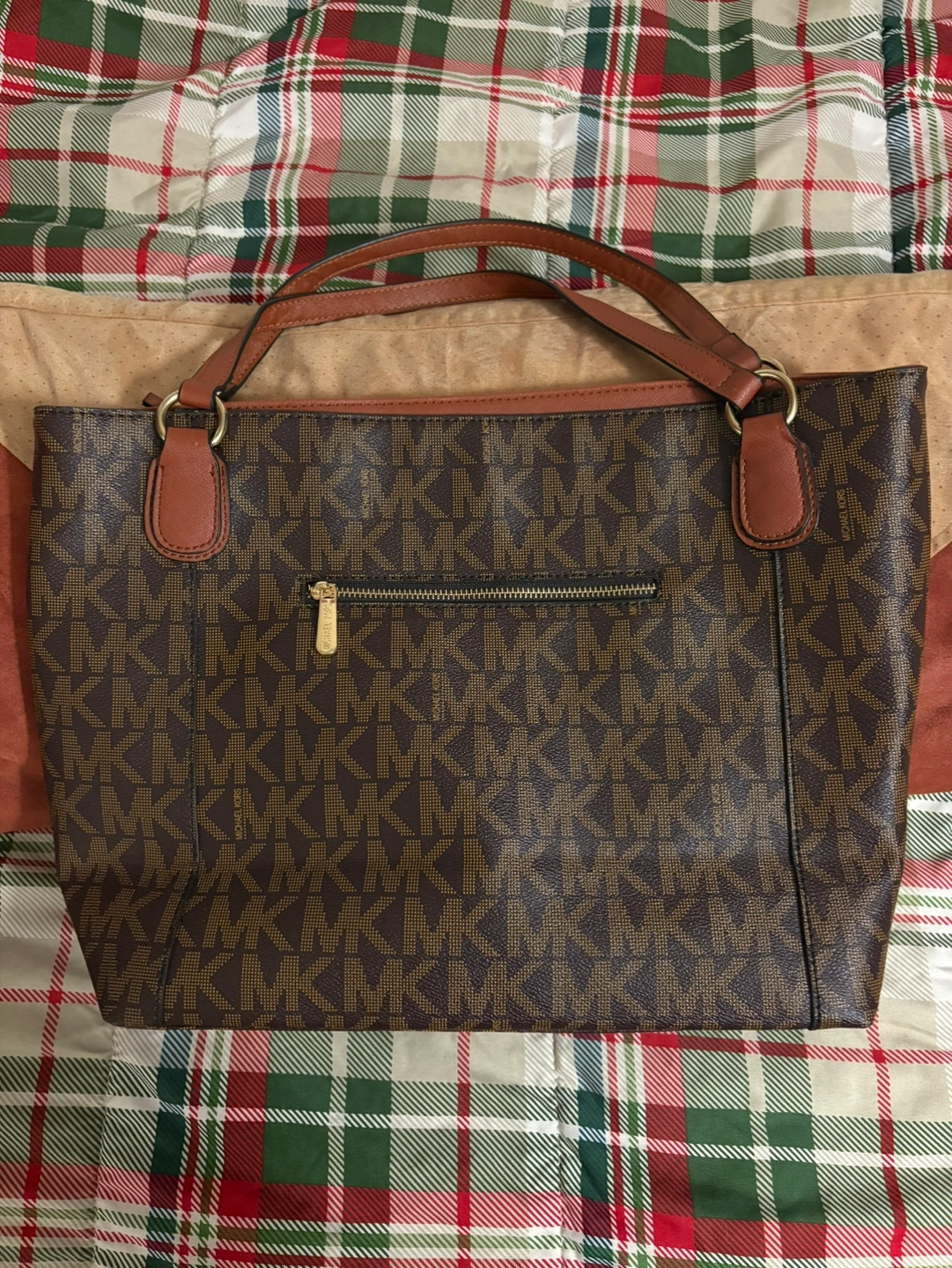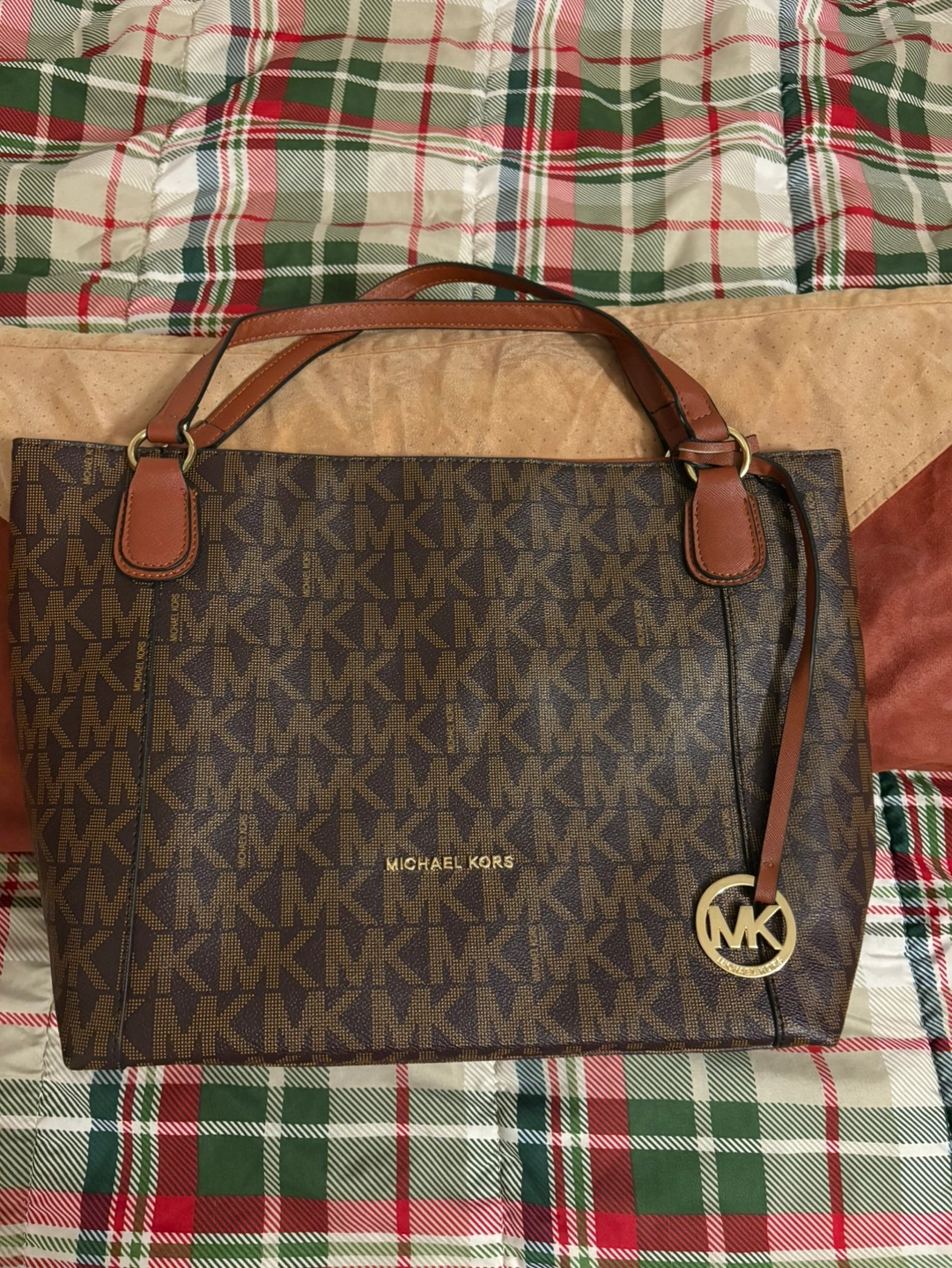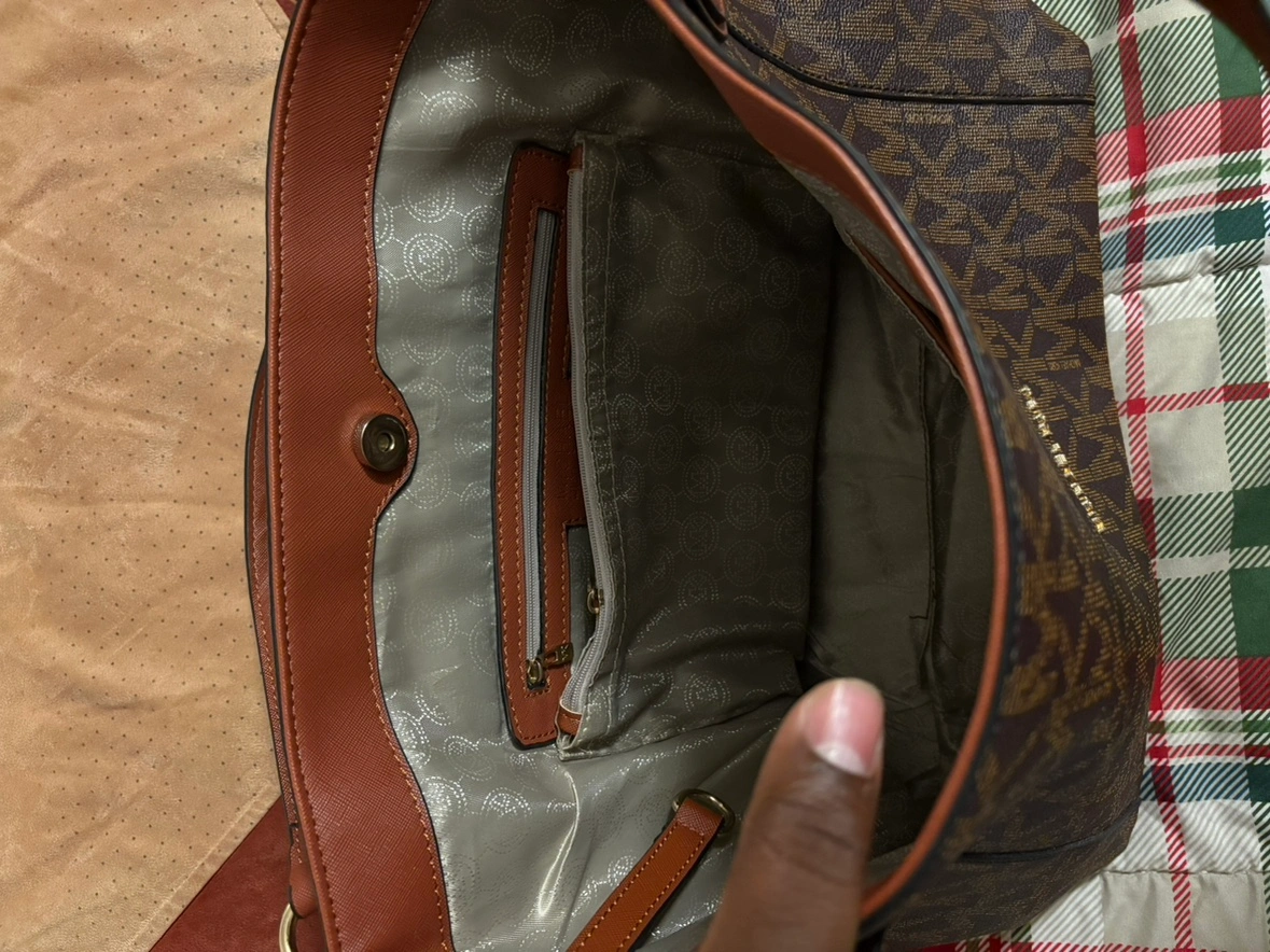 Brown tote bag with a brown leather strap. Has a zippered pocket on the outside and multiple pockets inside. Has an MK logo on the front and a gold chain on the inside.