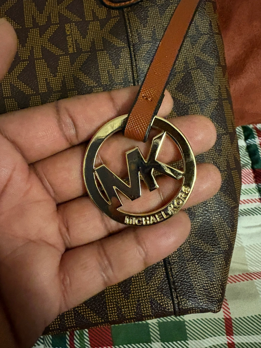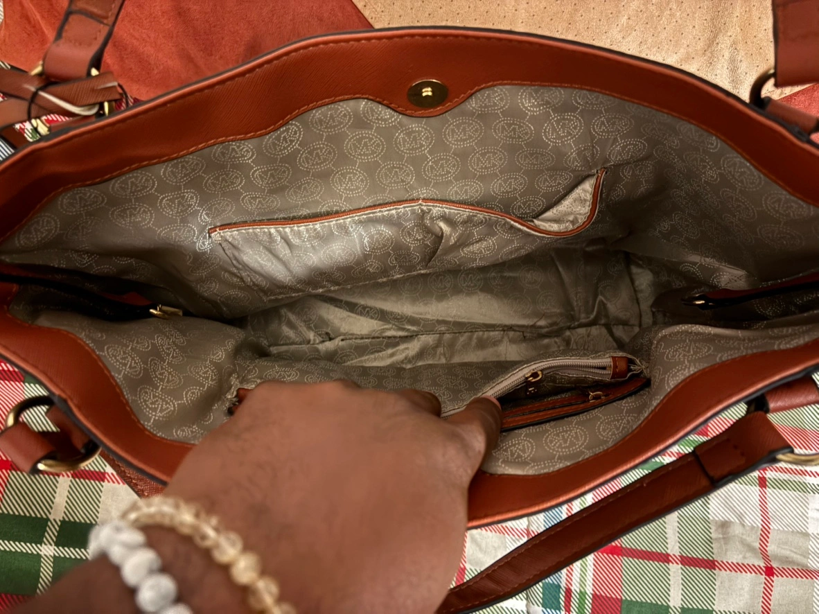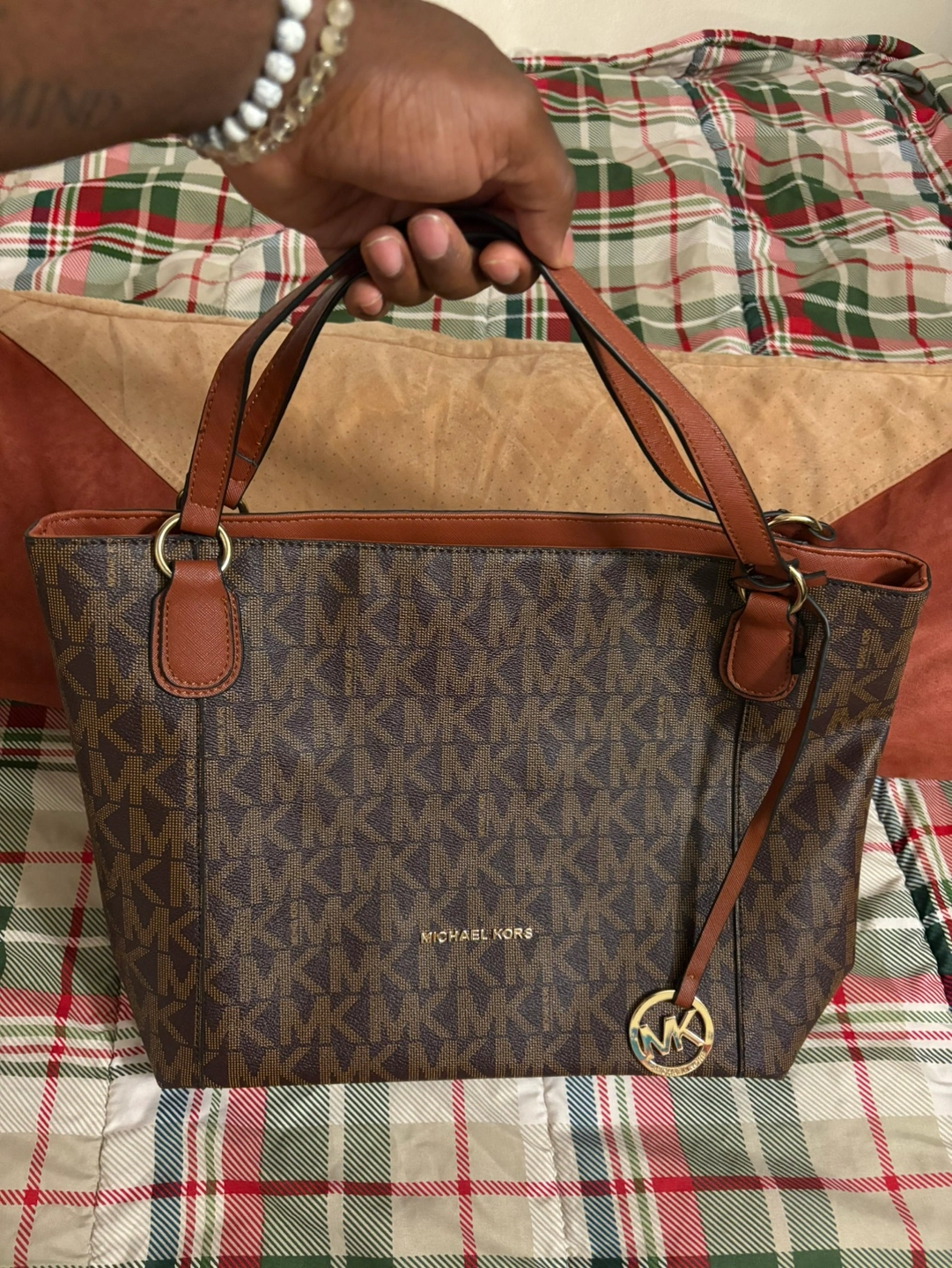 Brown tote bag with a brown leather strap. Has a zippered pocket on the outside and multiple pockets inside. Has an MK logo on the front and a gold chain on the inside.