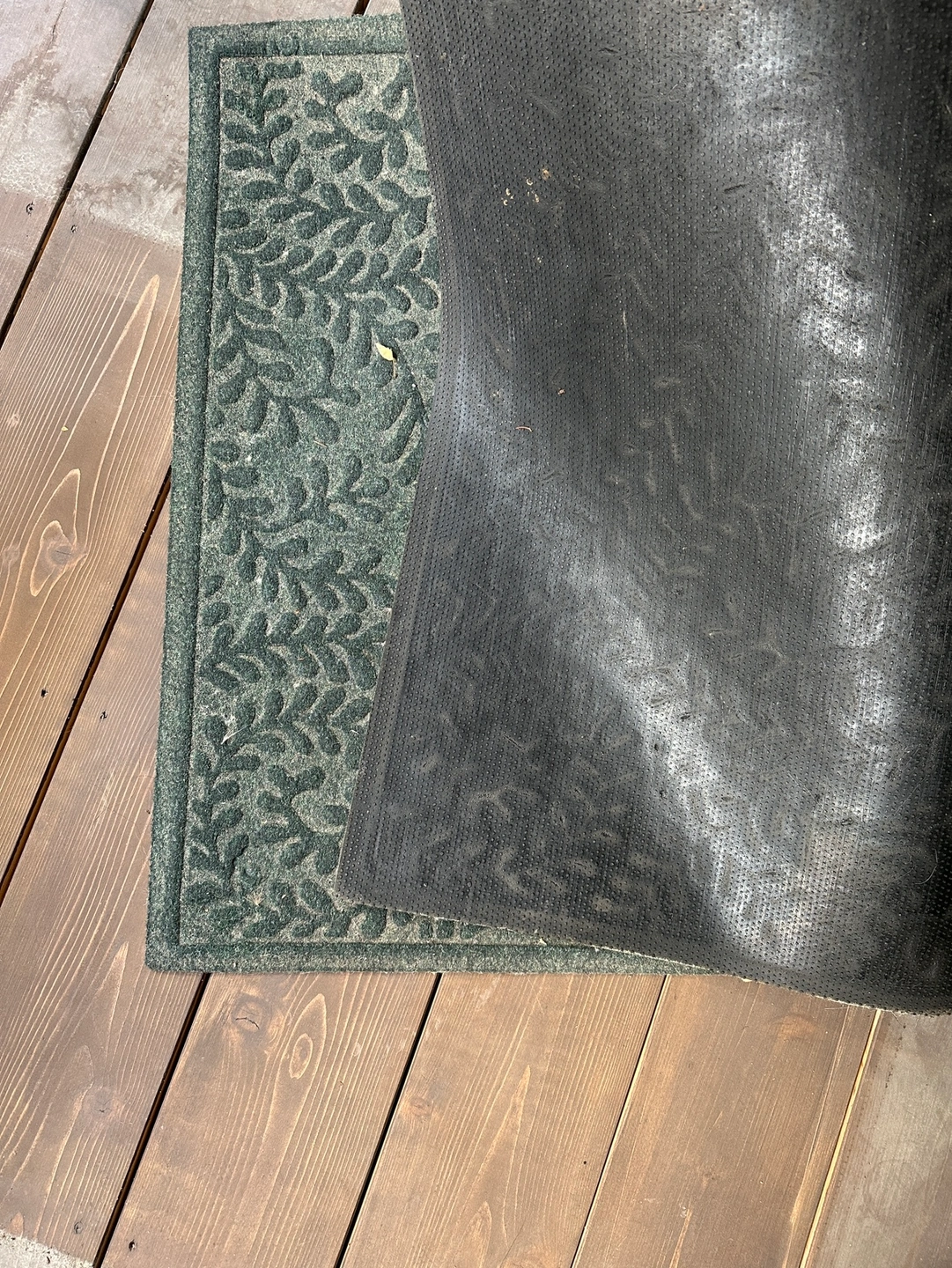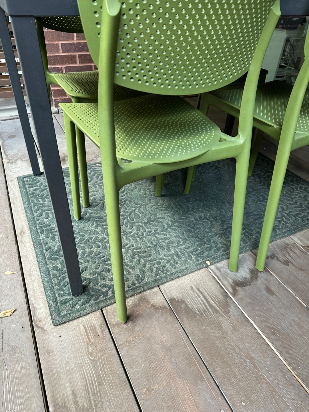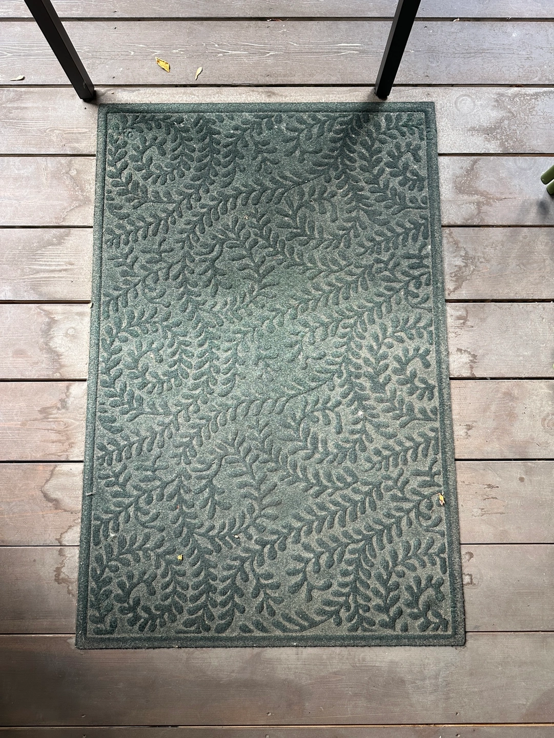 Dark green outdoor rug with a leaf pattern. Has a rubber backing.
