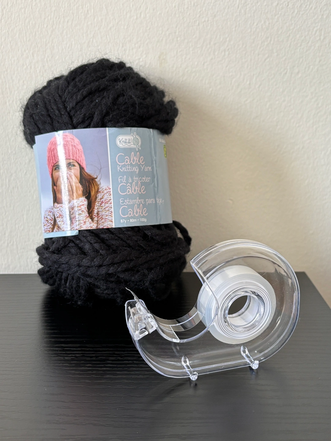 One skein of black polyester cable knitting yarn and about half a roll of double-sided tape. Can take both or one! From a smoke & pet-free home. Pick up at RBC - Sheppard & Bathurst