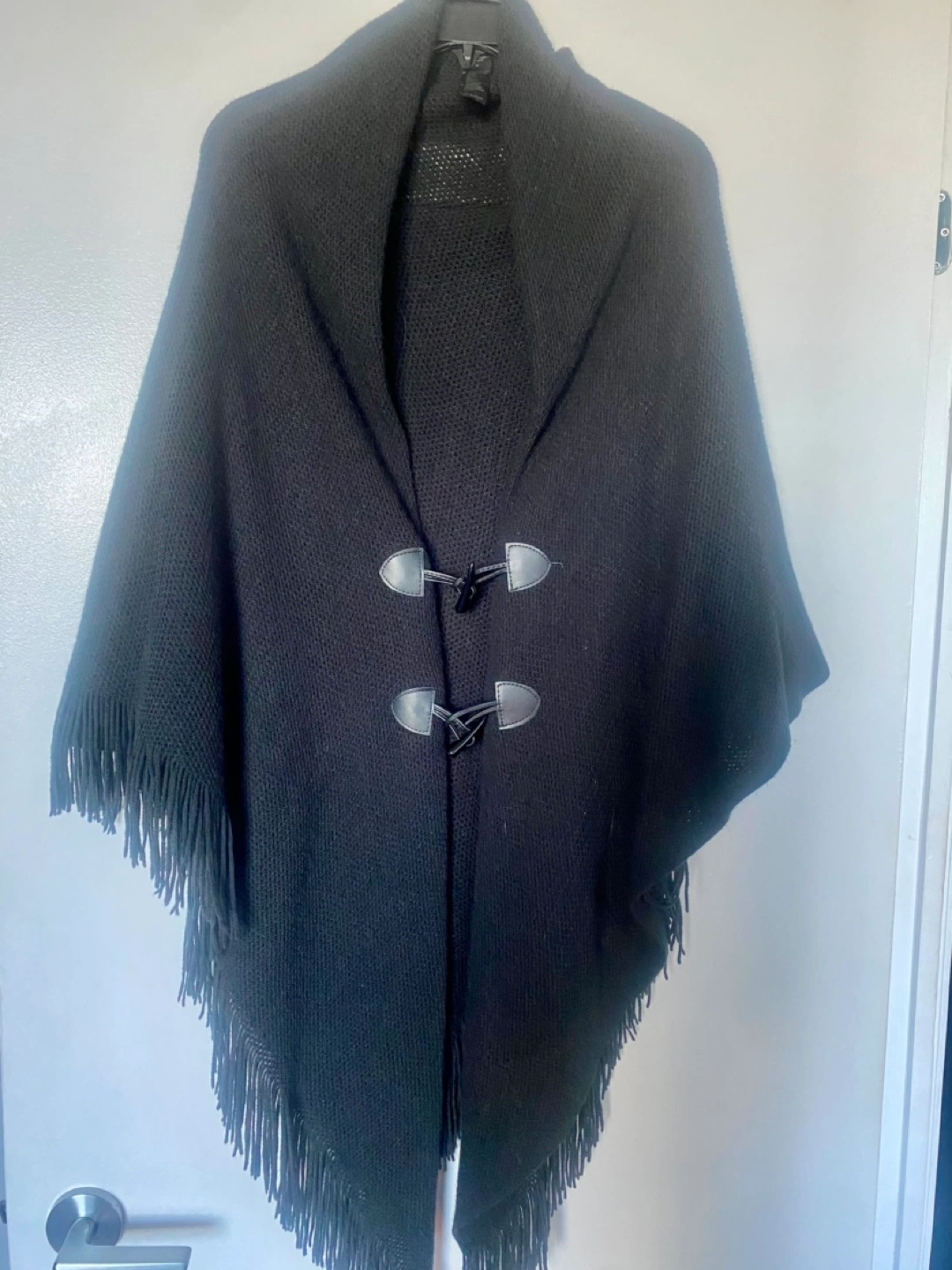 Black knit poncho with fringe trim. Features a toggle closure at the neck. Soft and cozy.