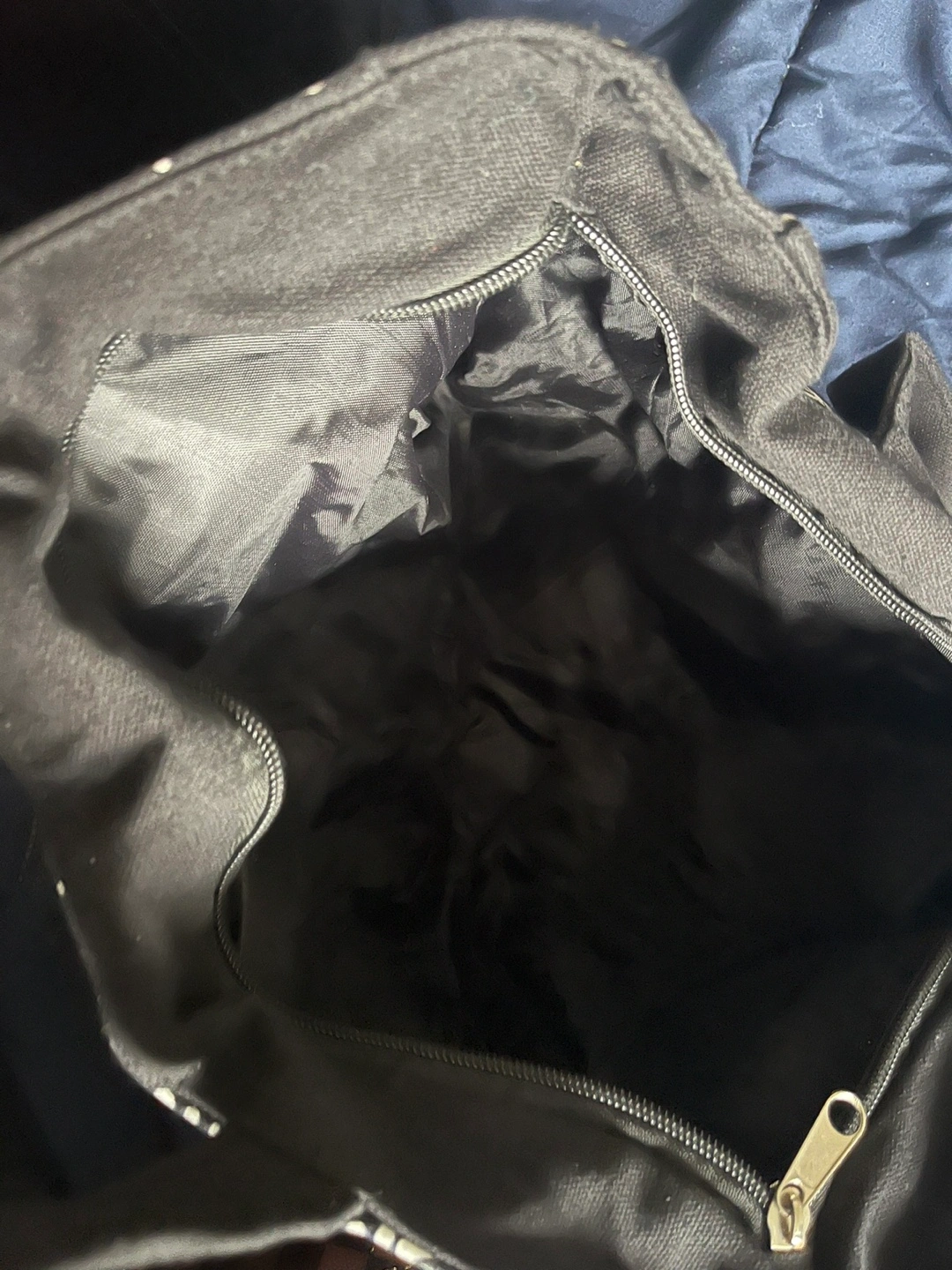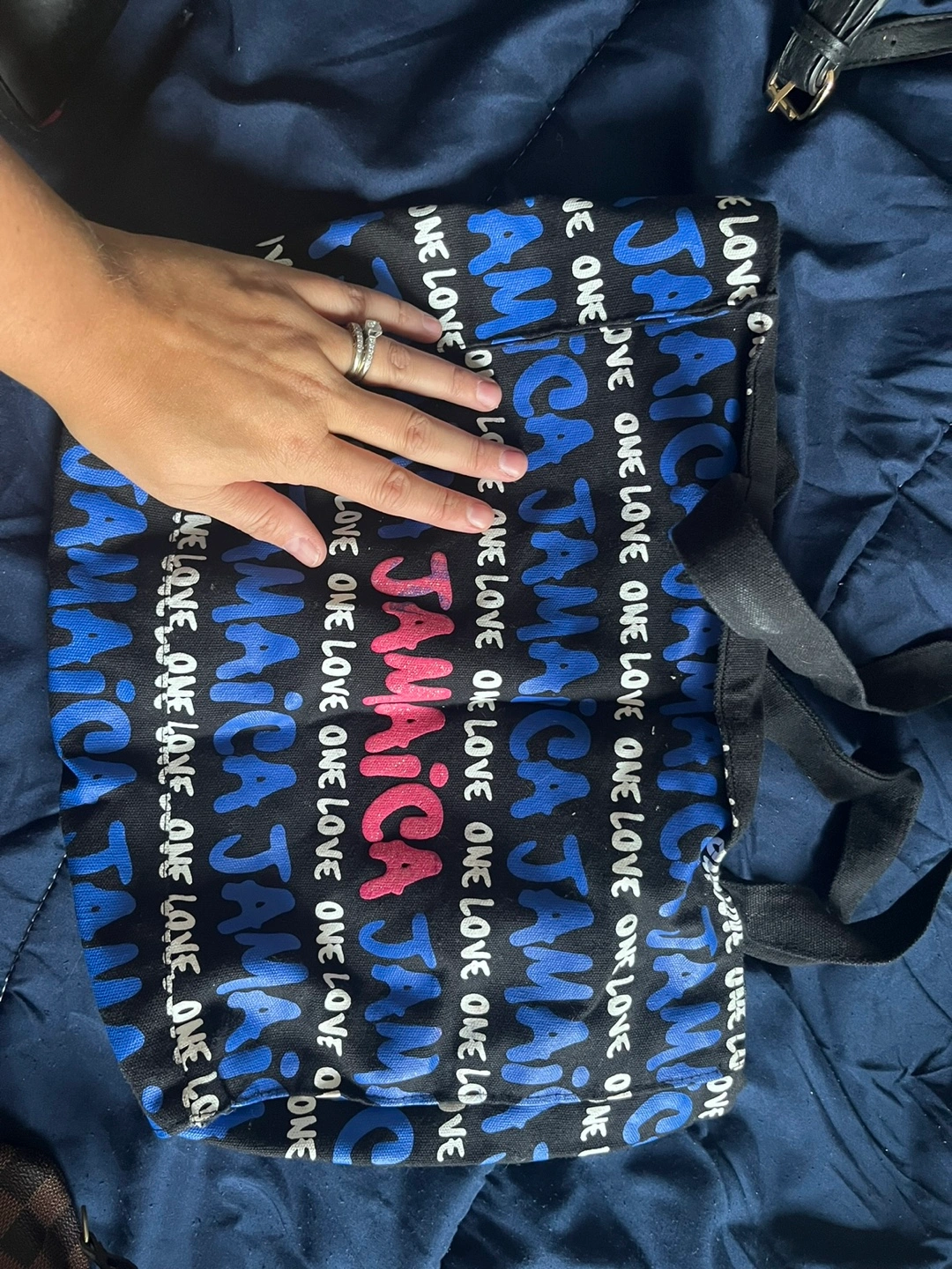 Black tote bag with a zipper closure. Features a colourful design with the word "Jamaica" repeated on the front.