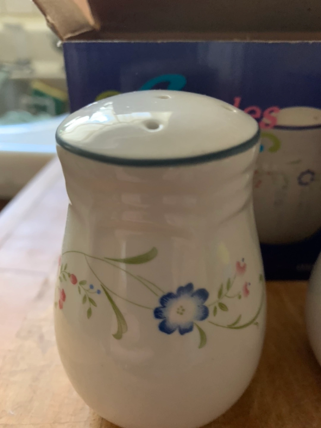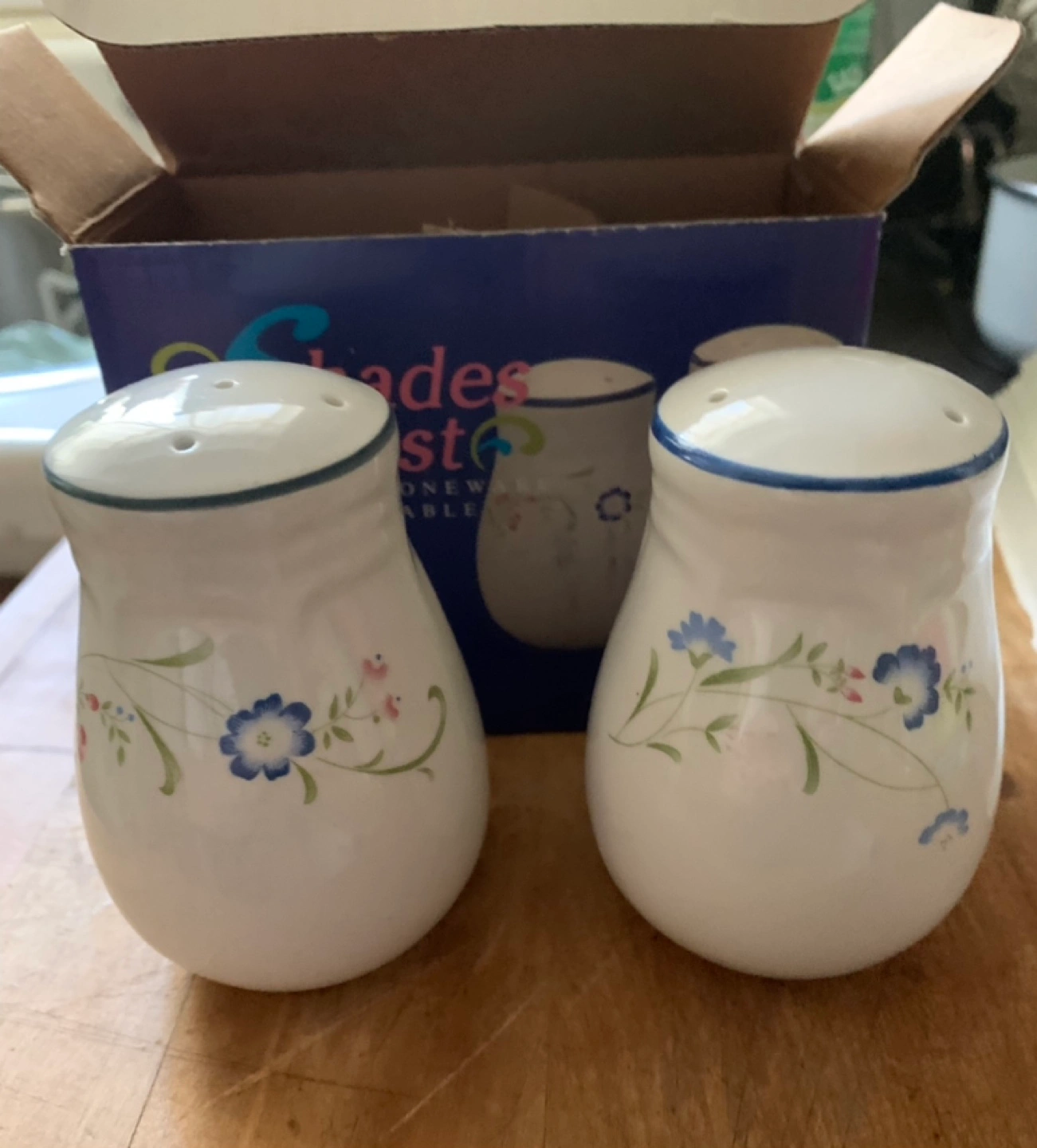 Stoneware Salt and pepper shakers in a floral pattern. Comes in the original box. New item - never used Moving sale - non smoking & no pet household