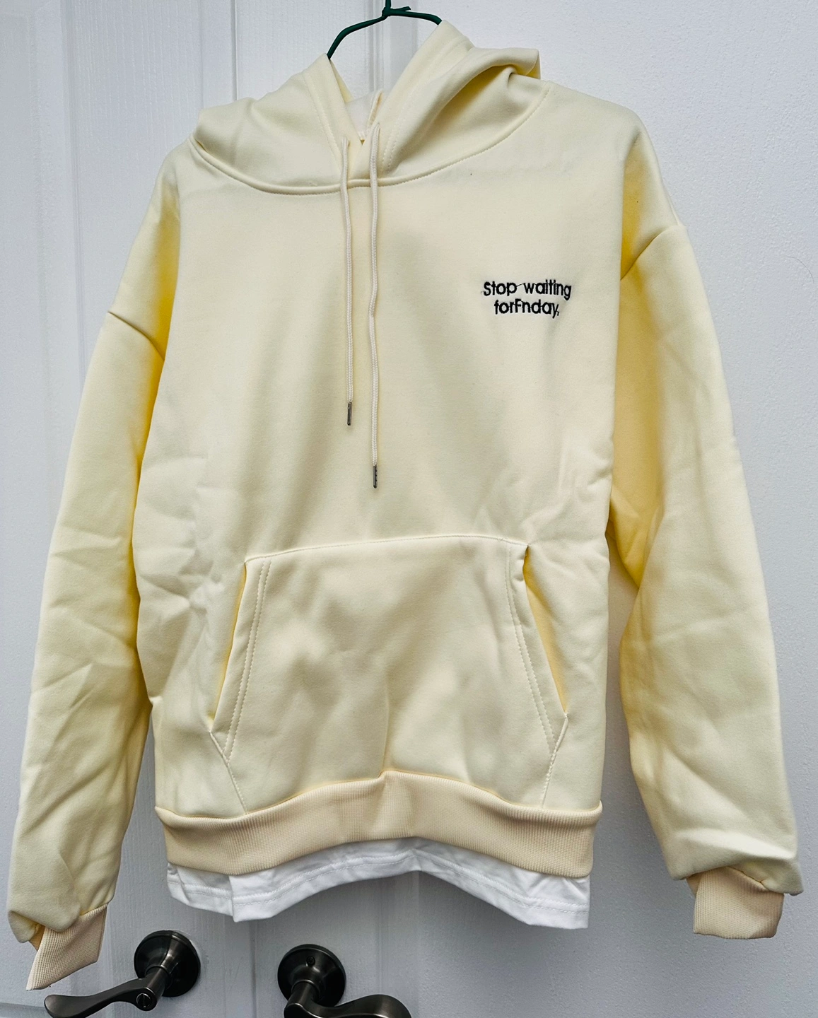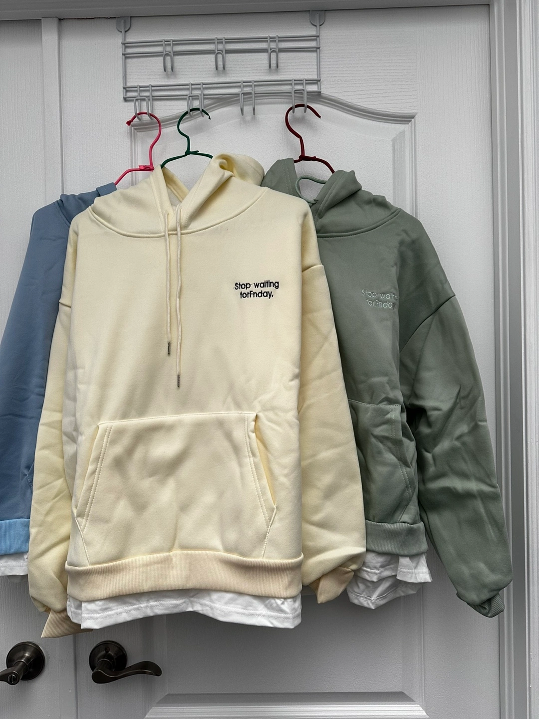 Light blue, cream, and green soft and warm cotton hoodies. Each has the phrase "Stop waiting for Friday" printed on the front. With white bottom hem. New without tag, $12 each or 2 for $22 ; $30 for 3.