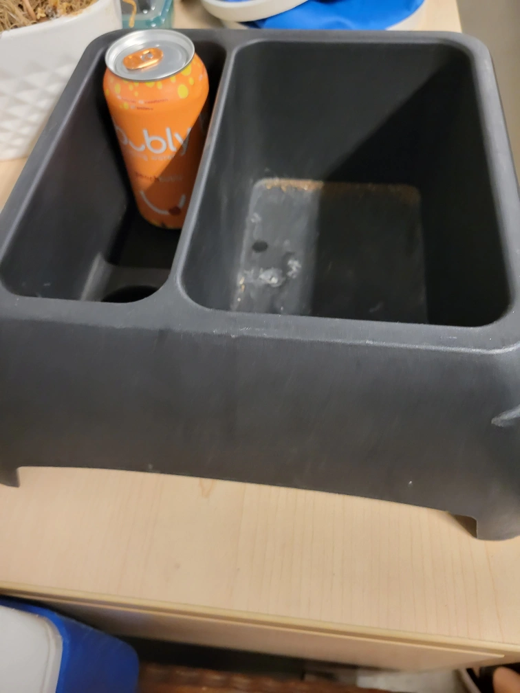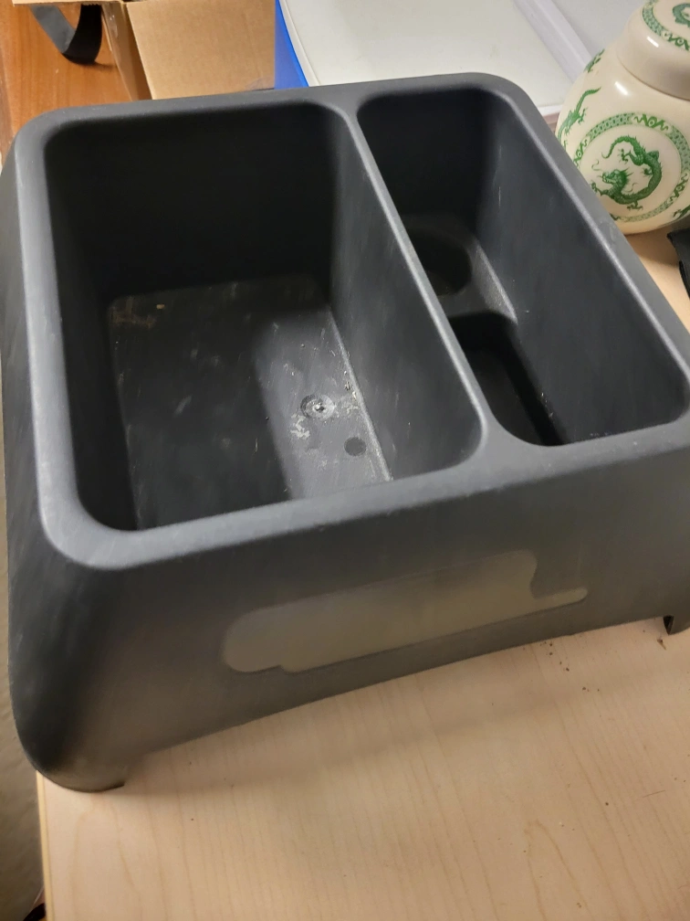 Black plastic centre console organizer with two compartments. One compartment has a small cup holder.
