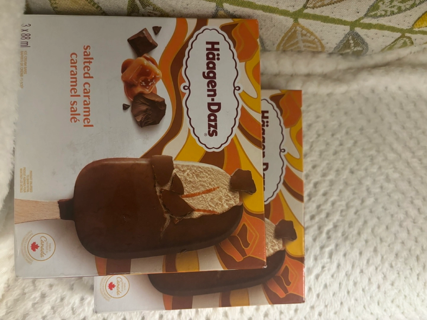 Three salted caramel ice cream bars on sticks, individually wrapped.