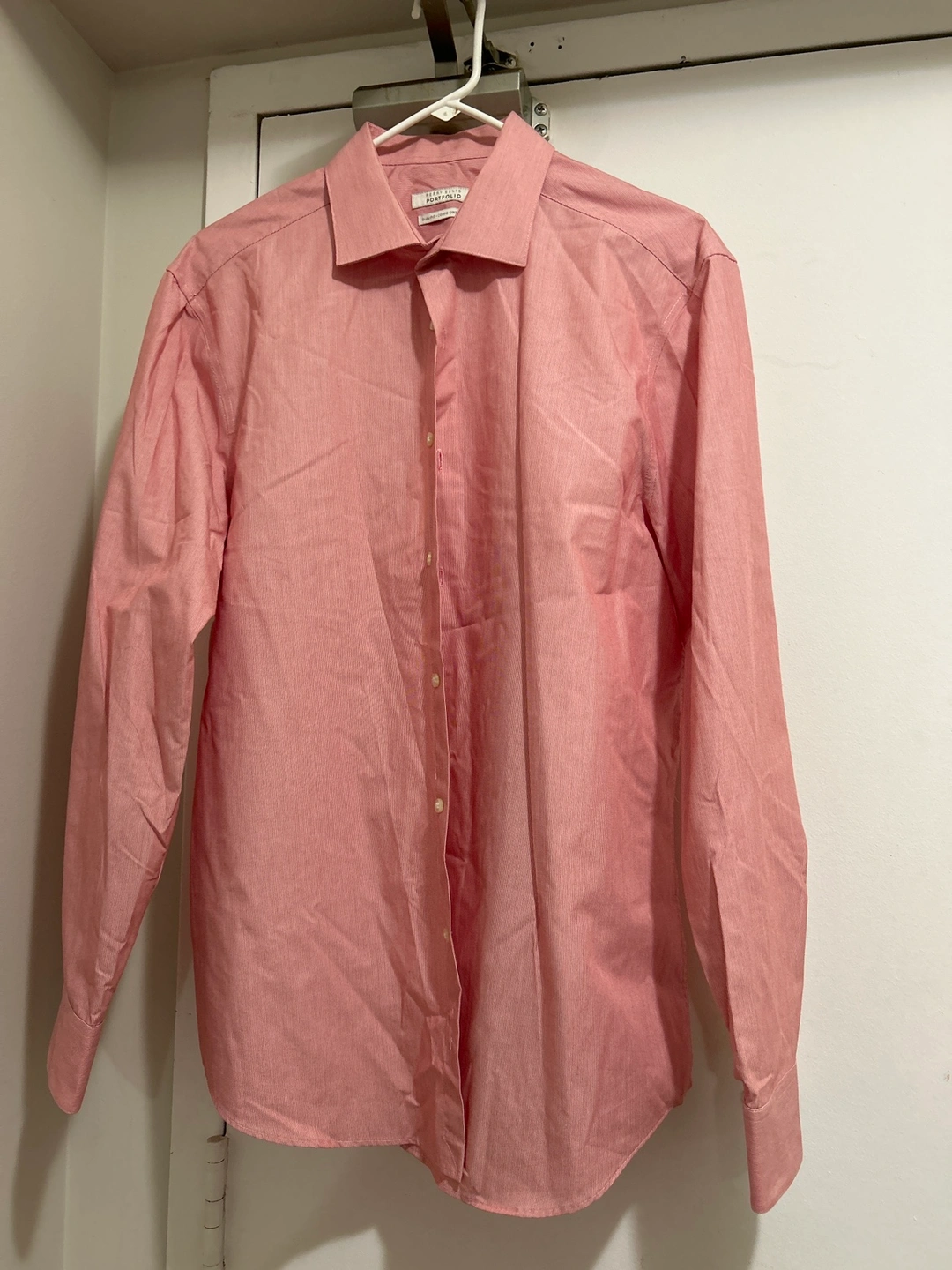 Long sleeve dress shirt with a pink and white striped pattern. Sorry, won’t respond to “Is this available” If the ad is up is available
