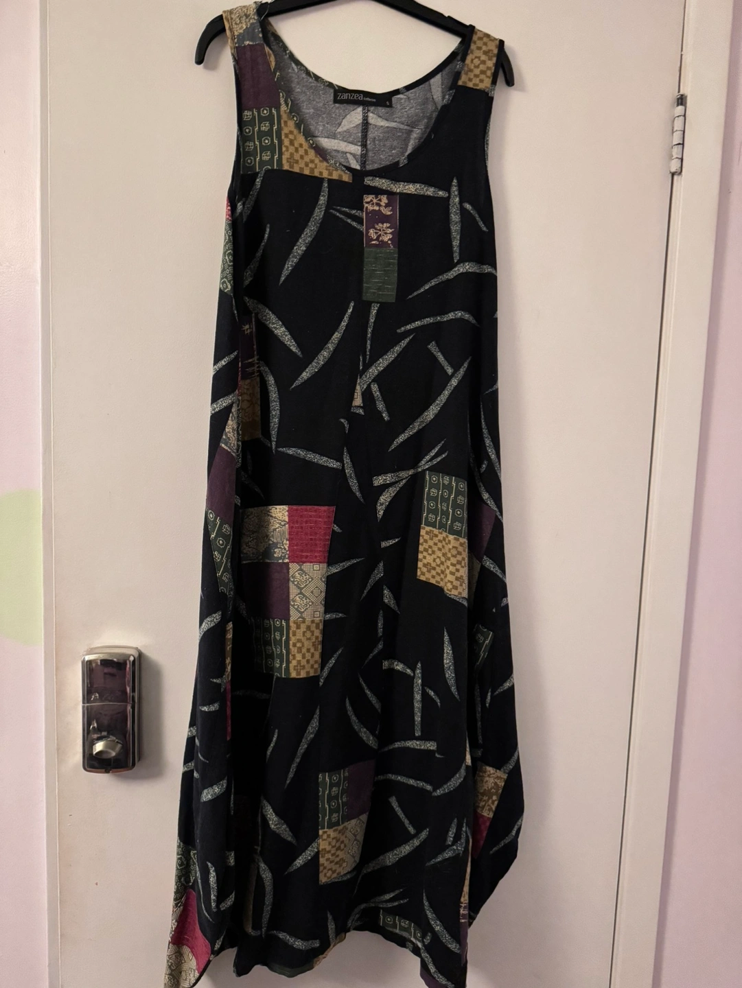 Sleeveless maxi dress with an asymmetrical hem. Black background with multicoloured geometric pattern.