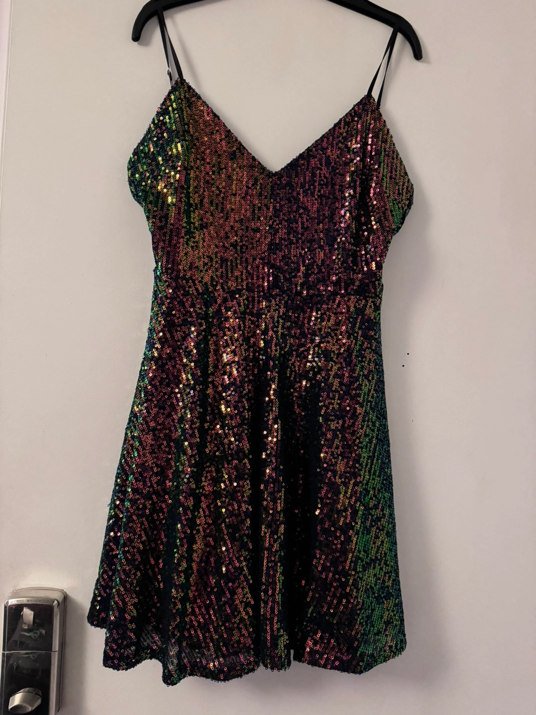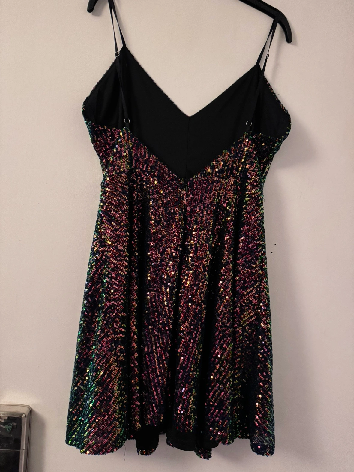 Sparkly iridescent sequin mini dress. Perfect for a night out. V-neck, adjustable straps.