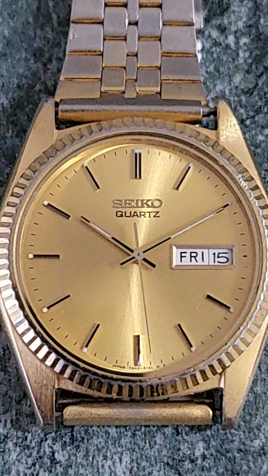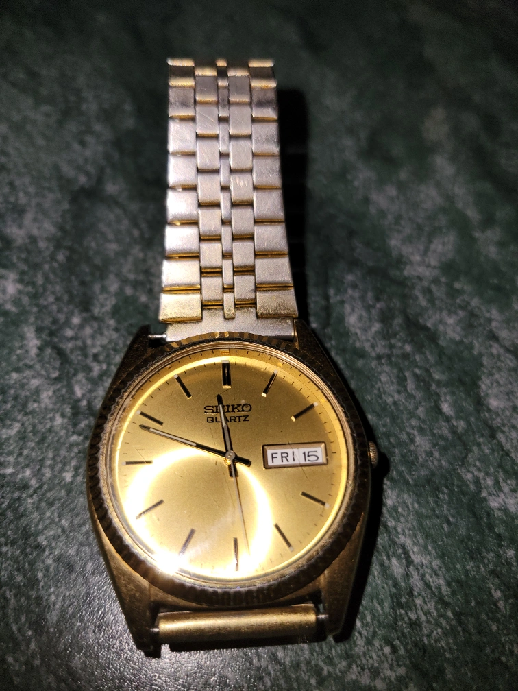 Gold-toned watch with a two-tone metal band. Quartz movement. Has day and date display. Price firm