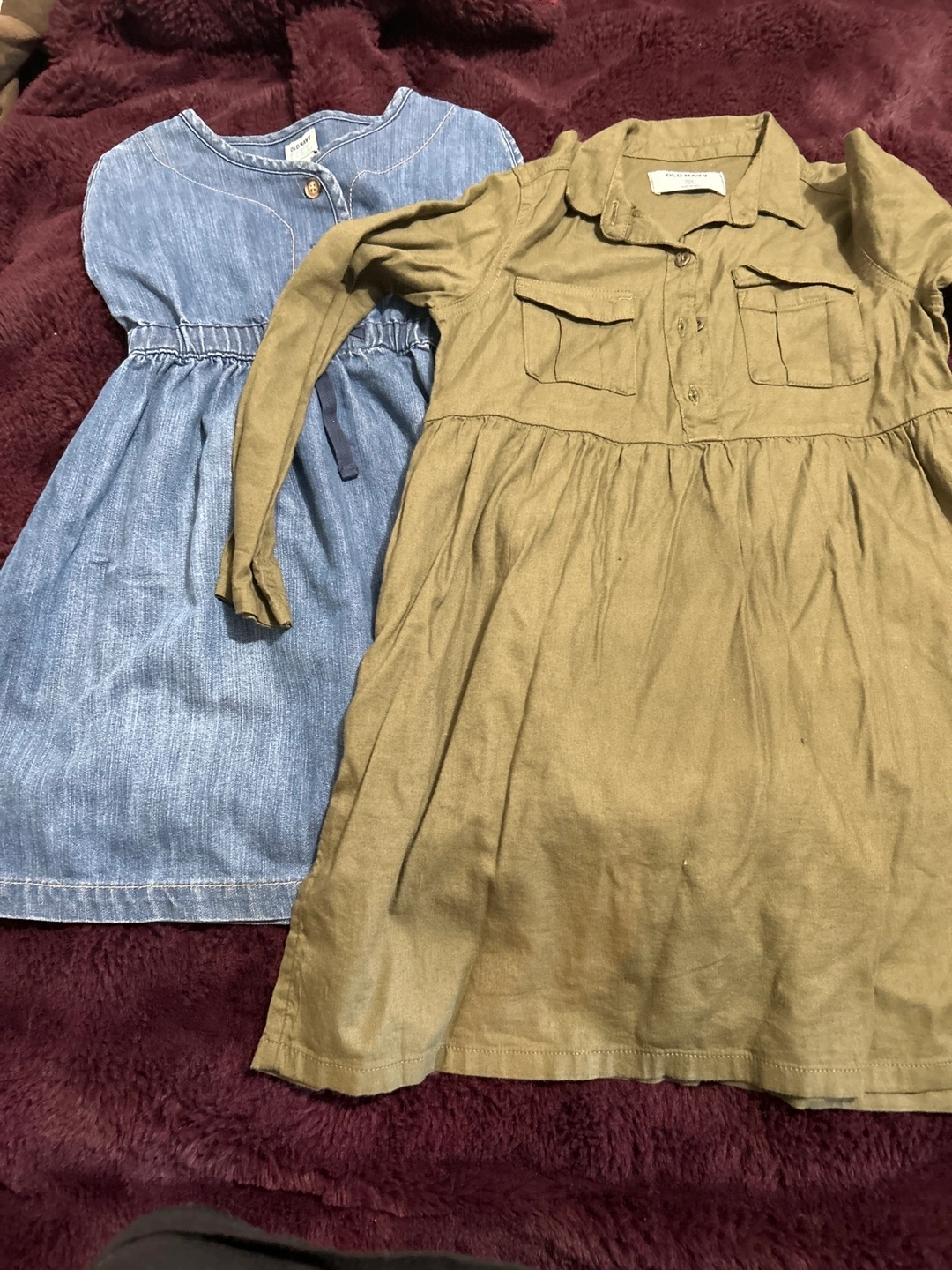 Two girls' dresses, one denim and one green. Long sleeve, button-up. Both are in good condition. Denim size 5 Green size6-7 Both $8