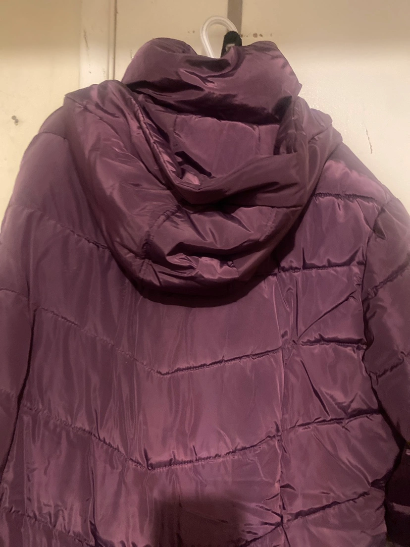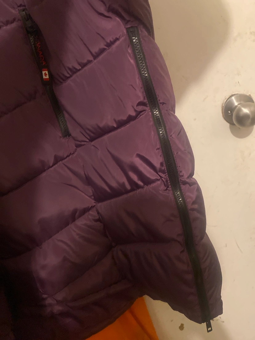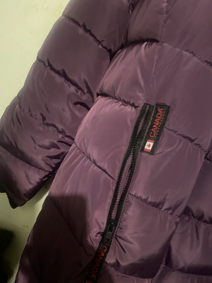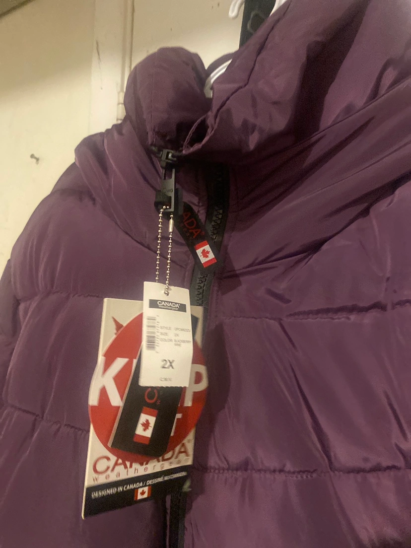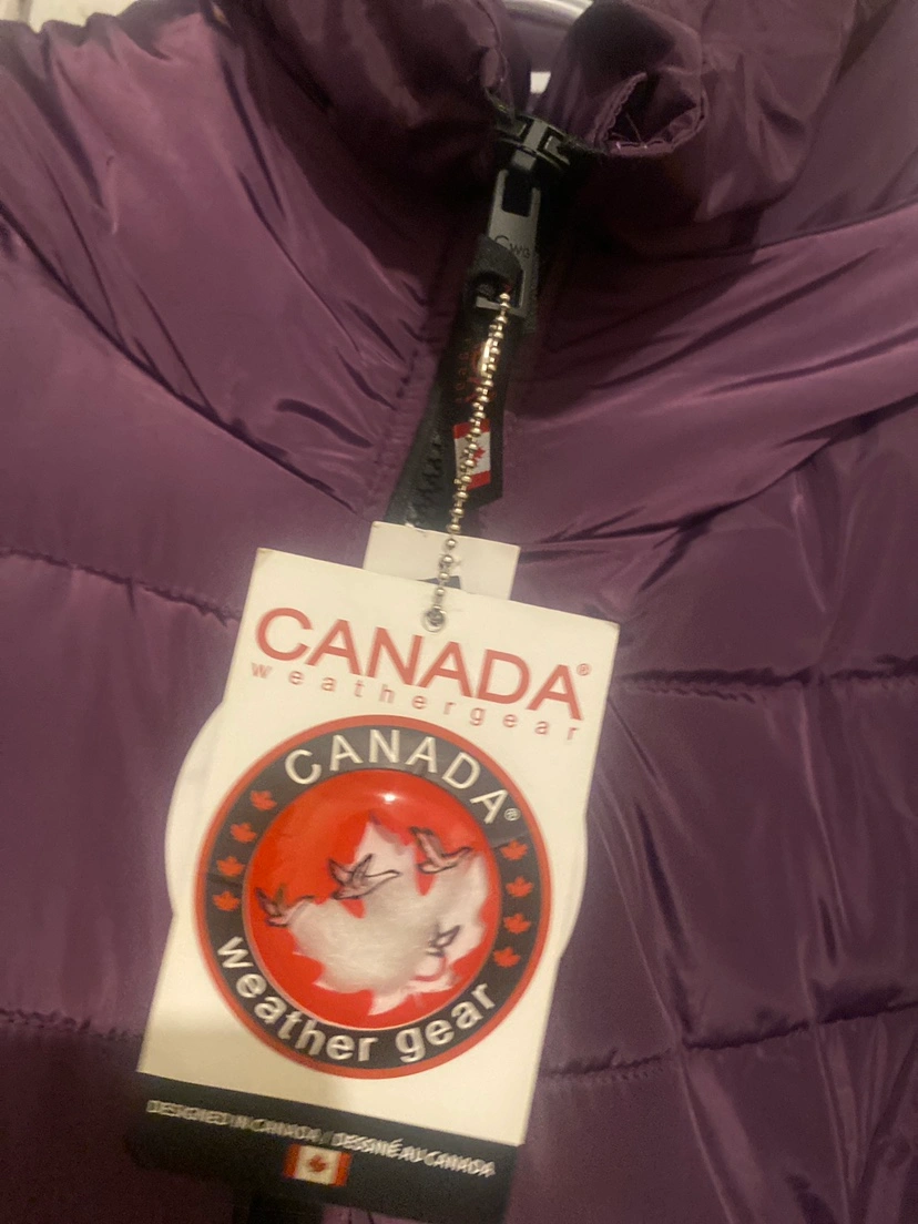 Long-sleeved, purple puffer jacket. Features a hood and zipper closure. Brand new size 2xl brand Canada weather gear