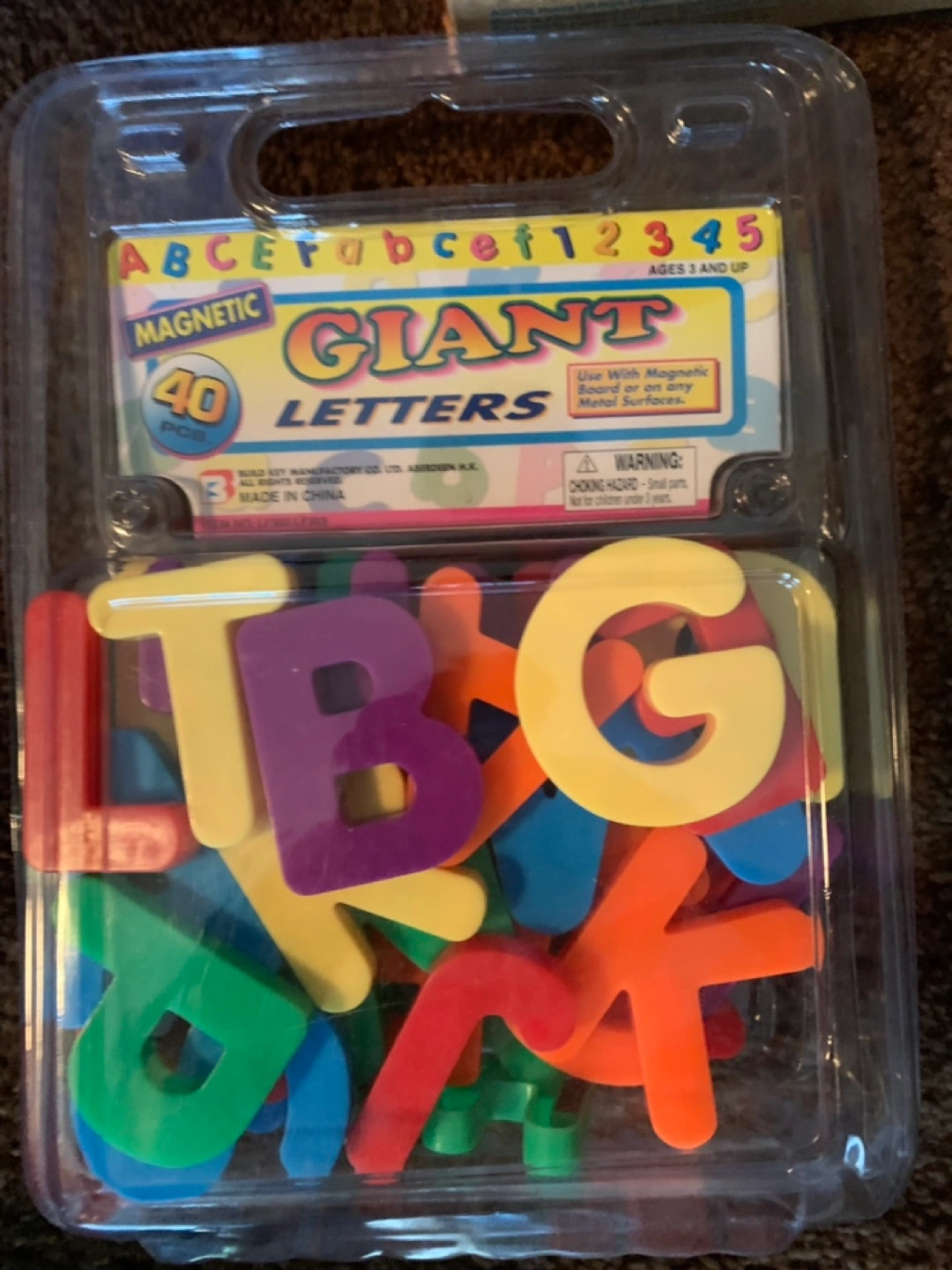 Magnetic letters, 40 pieces. Use on a magnetic board or any metal surface. Ages 3 and up. Quality item New in sealed packaging Moving sale - non smoking & no pet household