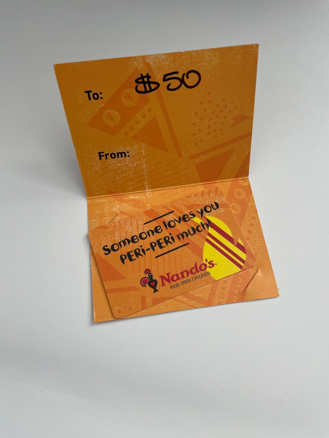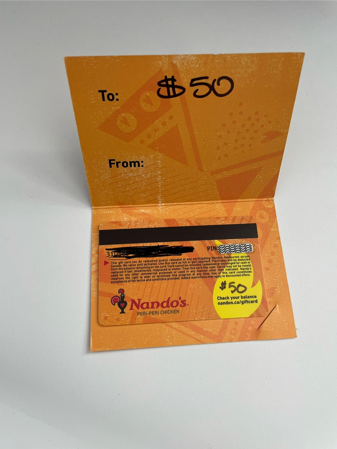 $50 Nando's gift card. Can be redeemed at any participating Nando's restaurant across Canada. No value activated until first purchase. ๐ Moving Sale. Everything must go. Please check out my other listings to create bundles.
