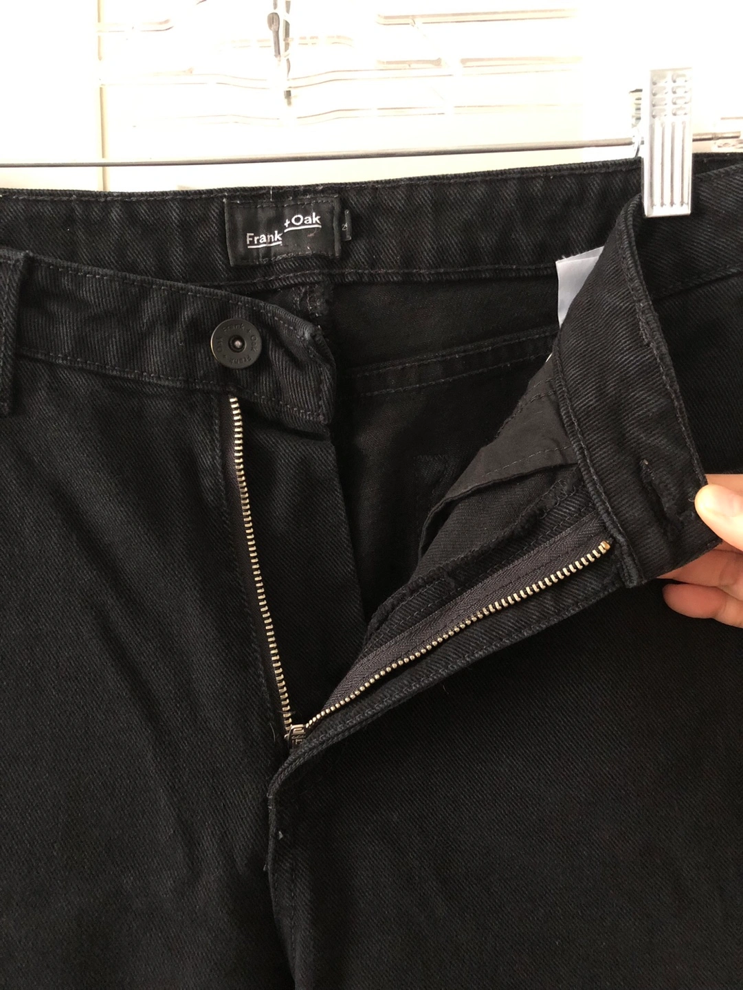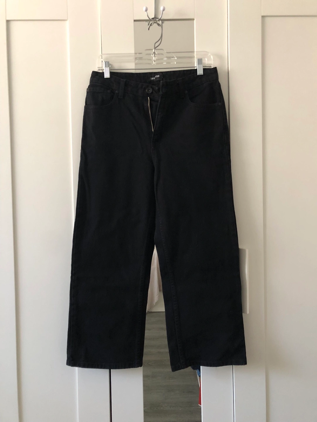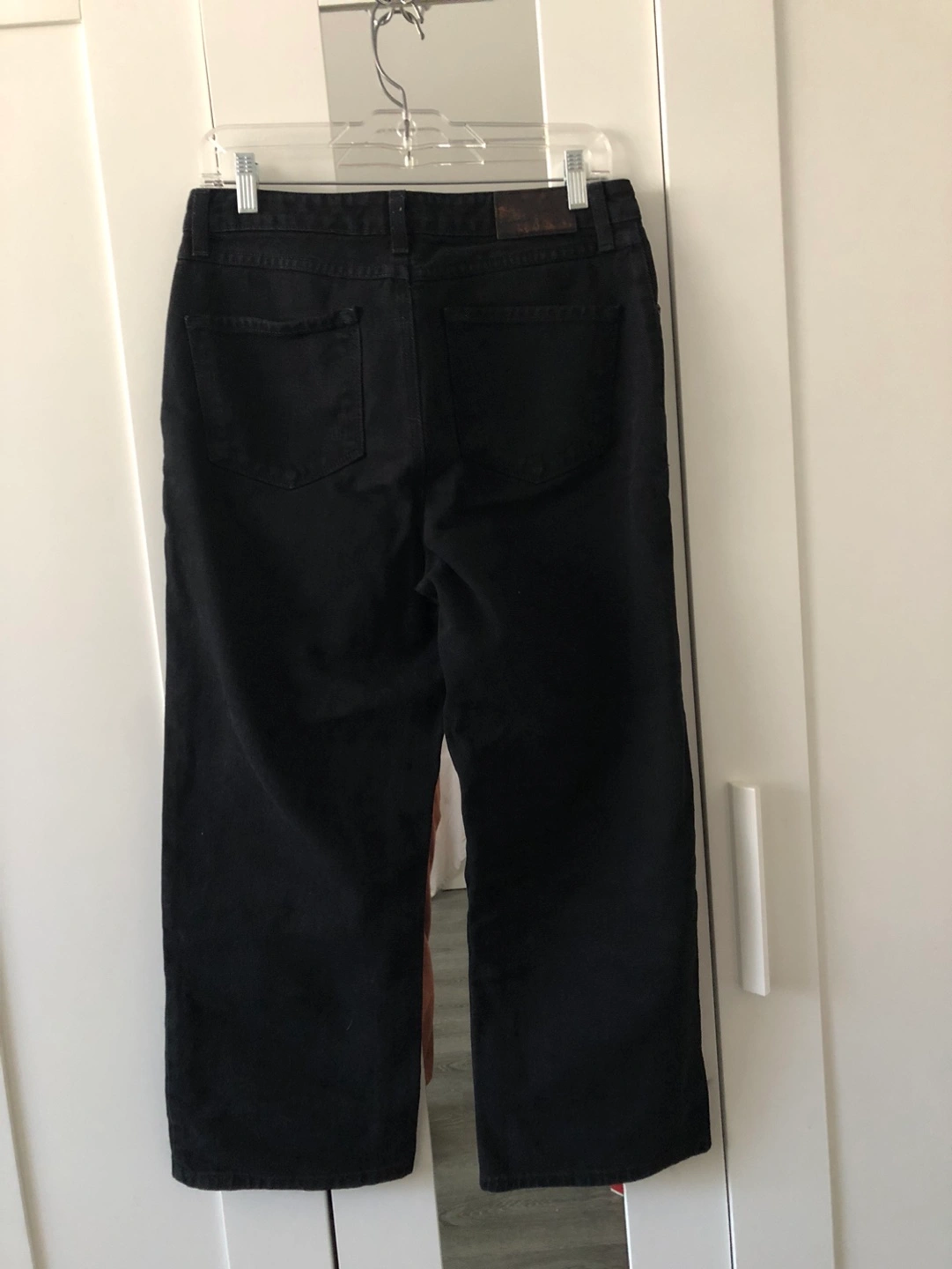Black jeans with a straight leg and thick denim. They are very cropped (24” inseam)! Sturdy construction lol the zipper, button, and overall fabric feel like they can stand A LOT of wear and tear. Only worn once, it’s just a bit too small :(