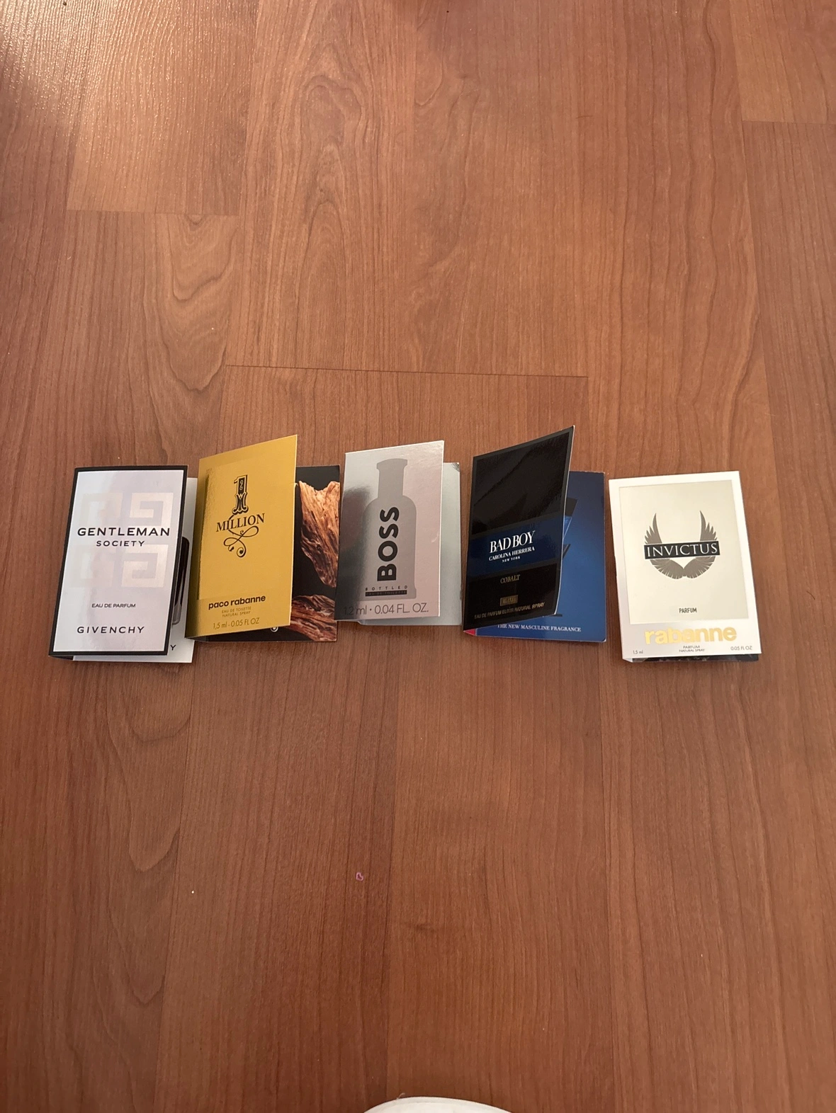 Set of six men's perfume samples. Includes Givenchy, Paco Rabanne, Boss, Carolina Herrera, and more. 3 dollars each.