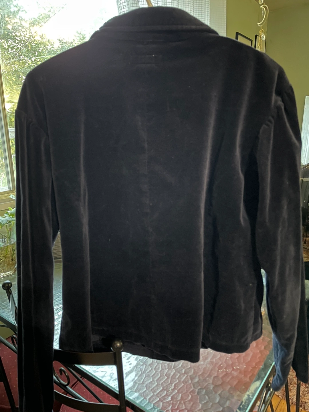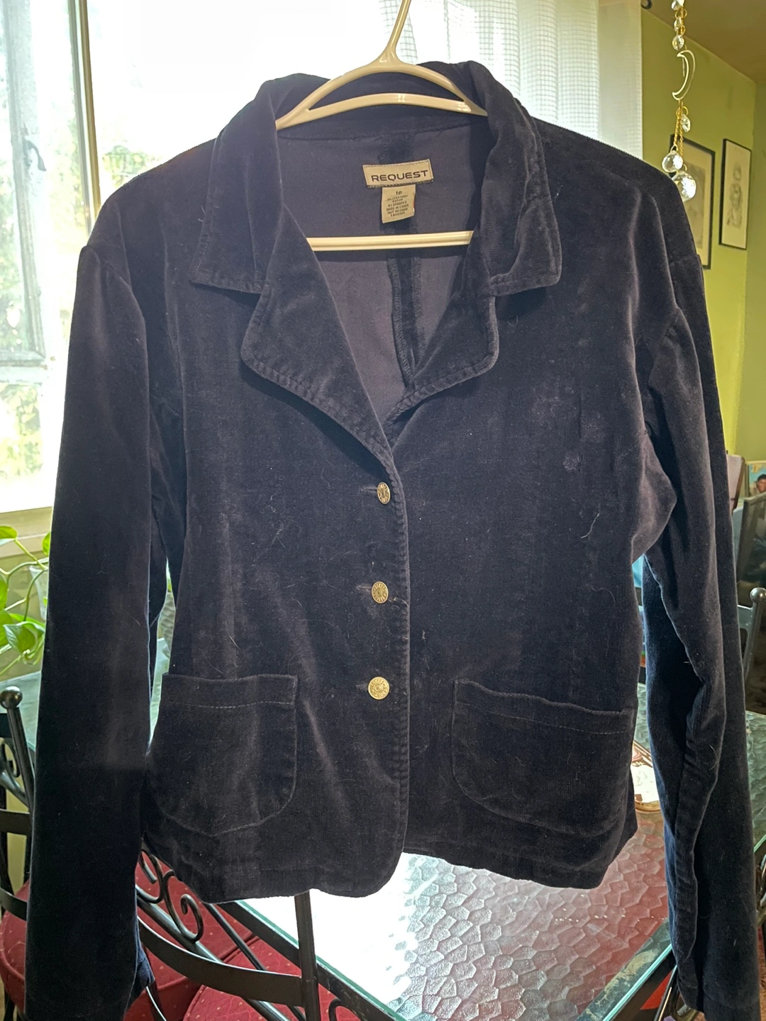 Navy blue velvet blazer with button closures. Has two pockets on the front. Long sleeves. Lightly worn, no major damages, like new condition Size 16
