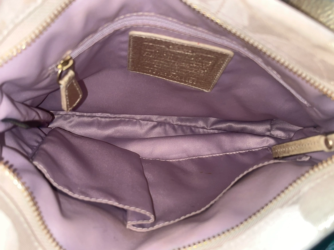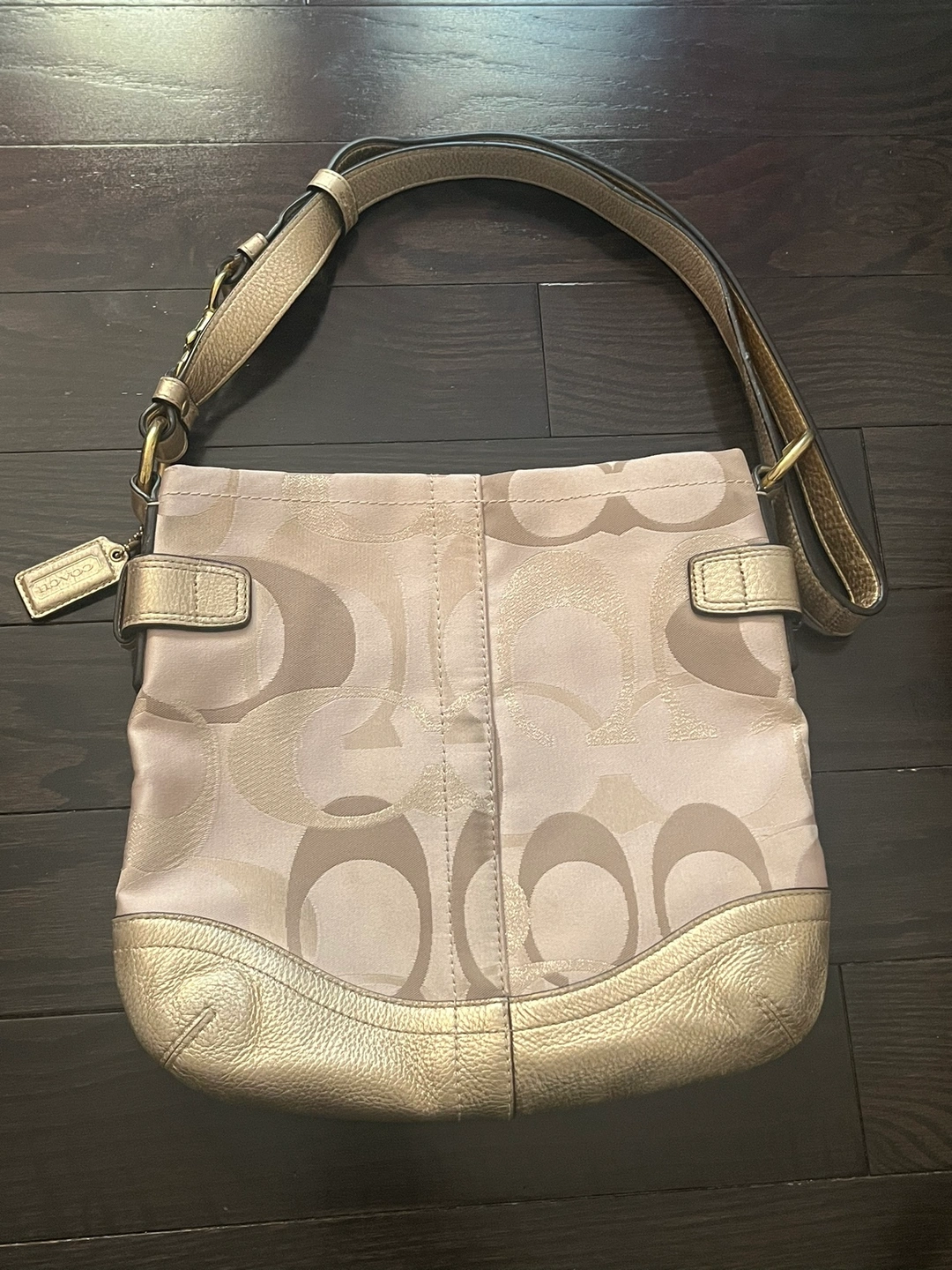 Preloved great condition Pickup Brampton or downtown Toronto Coach Optic Metallic Signature Chain Duffle Crossbody with Gold Leather Trim Color: Light Khaki/Gold Gold Hardware Coach Front Chain One inside Zipper pocket with Leather Pull Tab Two interior slip pockets Authentic Leather Legacy Creed with Serial Number Zippered Top closure with large lather pull Internal Gray Lining Coach Embossed Hang Tag 12” double leather strap which converts to single 22.5” Cross body strap Size: 12 (L)x 11 (H)x 2 3/4(D)