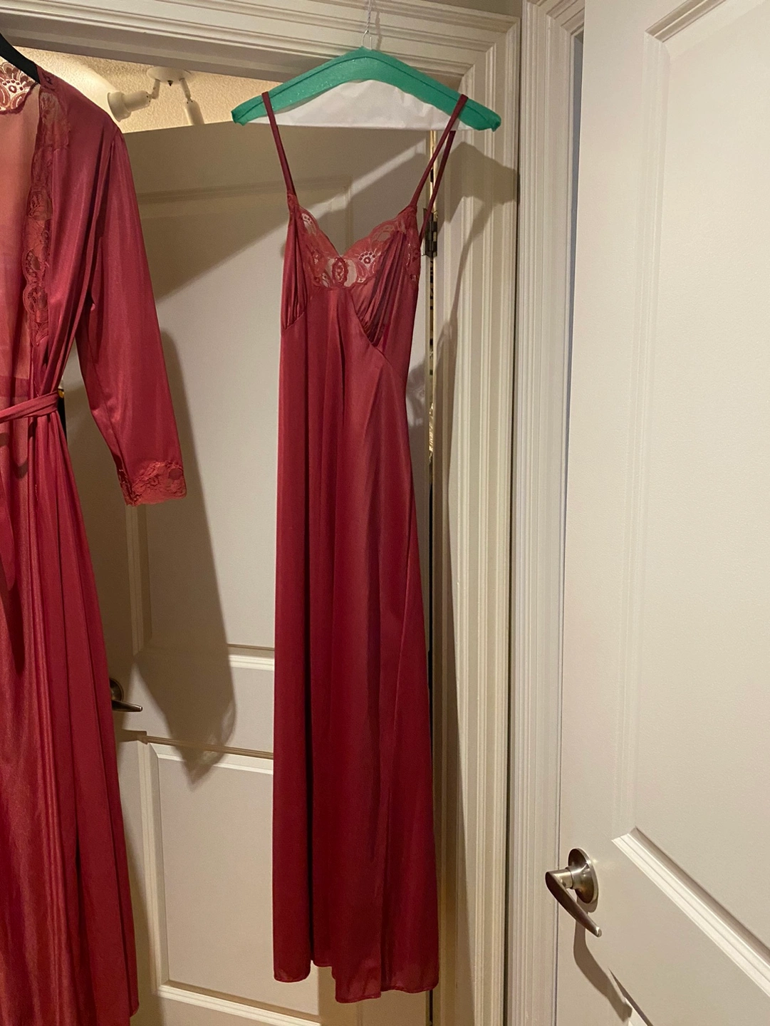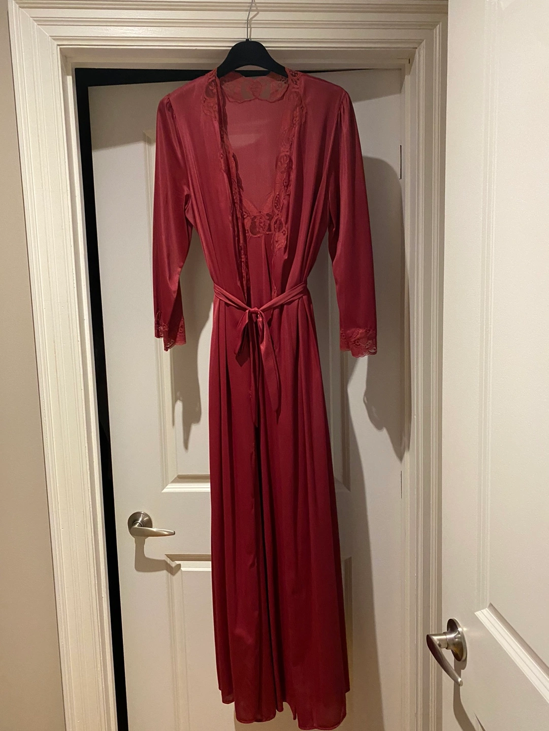 This is a 2 piece Burgundy satin lingerie, robe and nightgown set. Both have lace detailing and a tie waist, never worn. Great for up and coming Valentine’s Day. Size is a loose Medium/Large