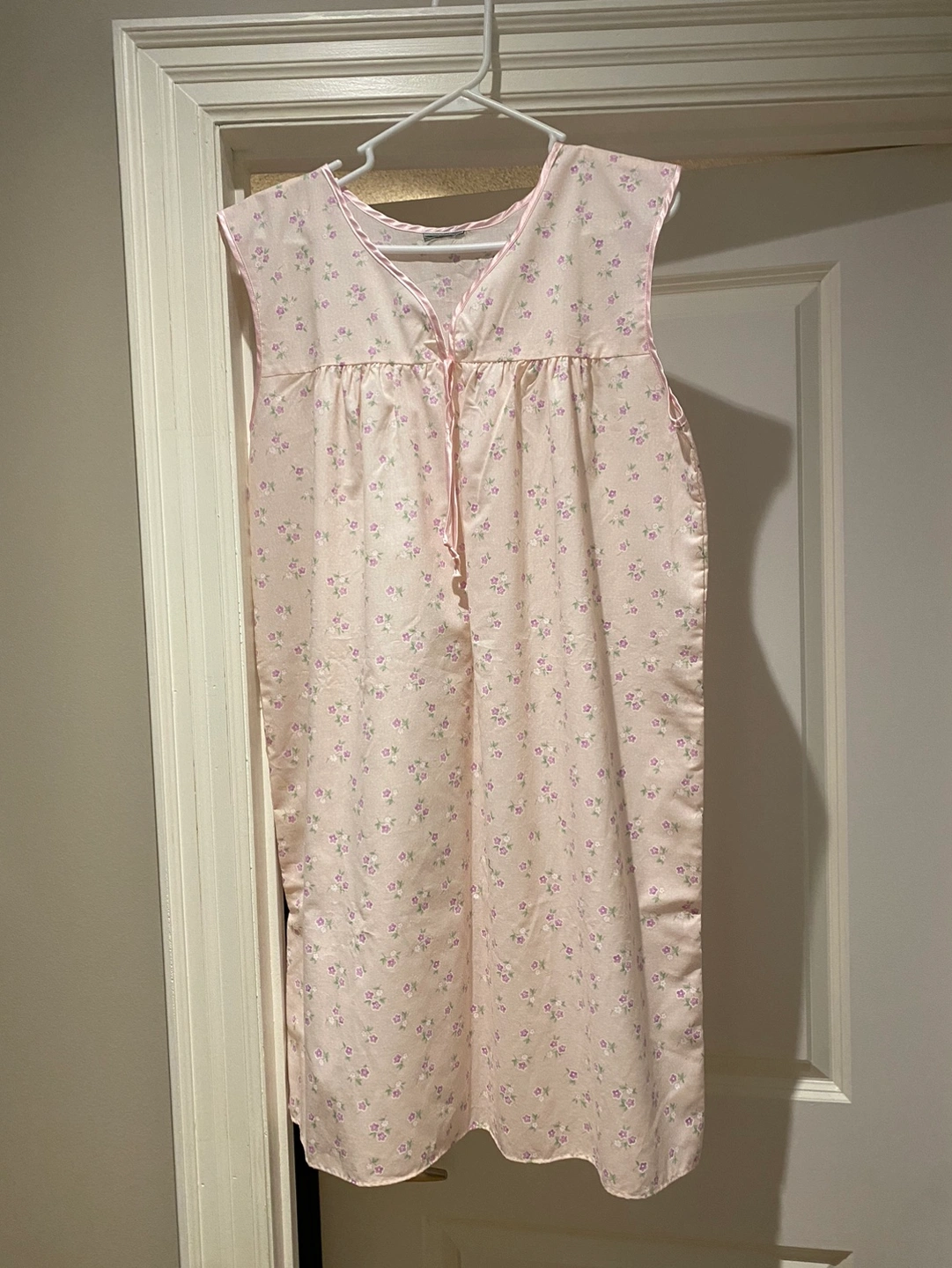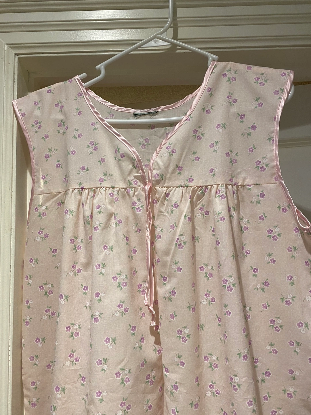 New nightgown with floral print, pink and purple flowers on a white background. Tie at neckline.