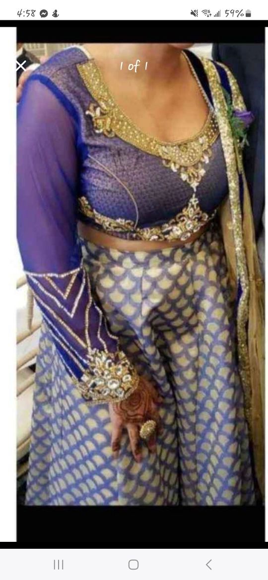 Purple and gold Indian suit with net sleeves and heavy embellishments. The sleeves have diamond-shaped sequins. The skirt is light blue with a geometric pattern. The top is a cropped style with a round neckline.
