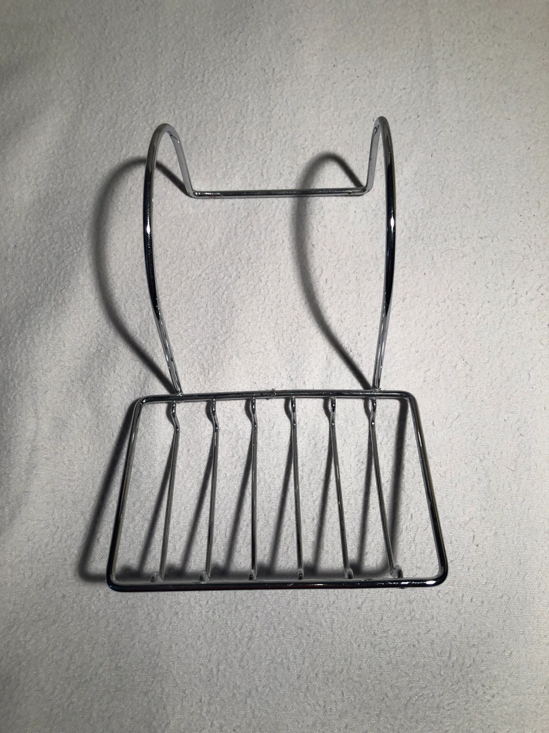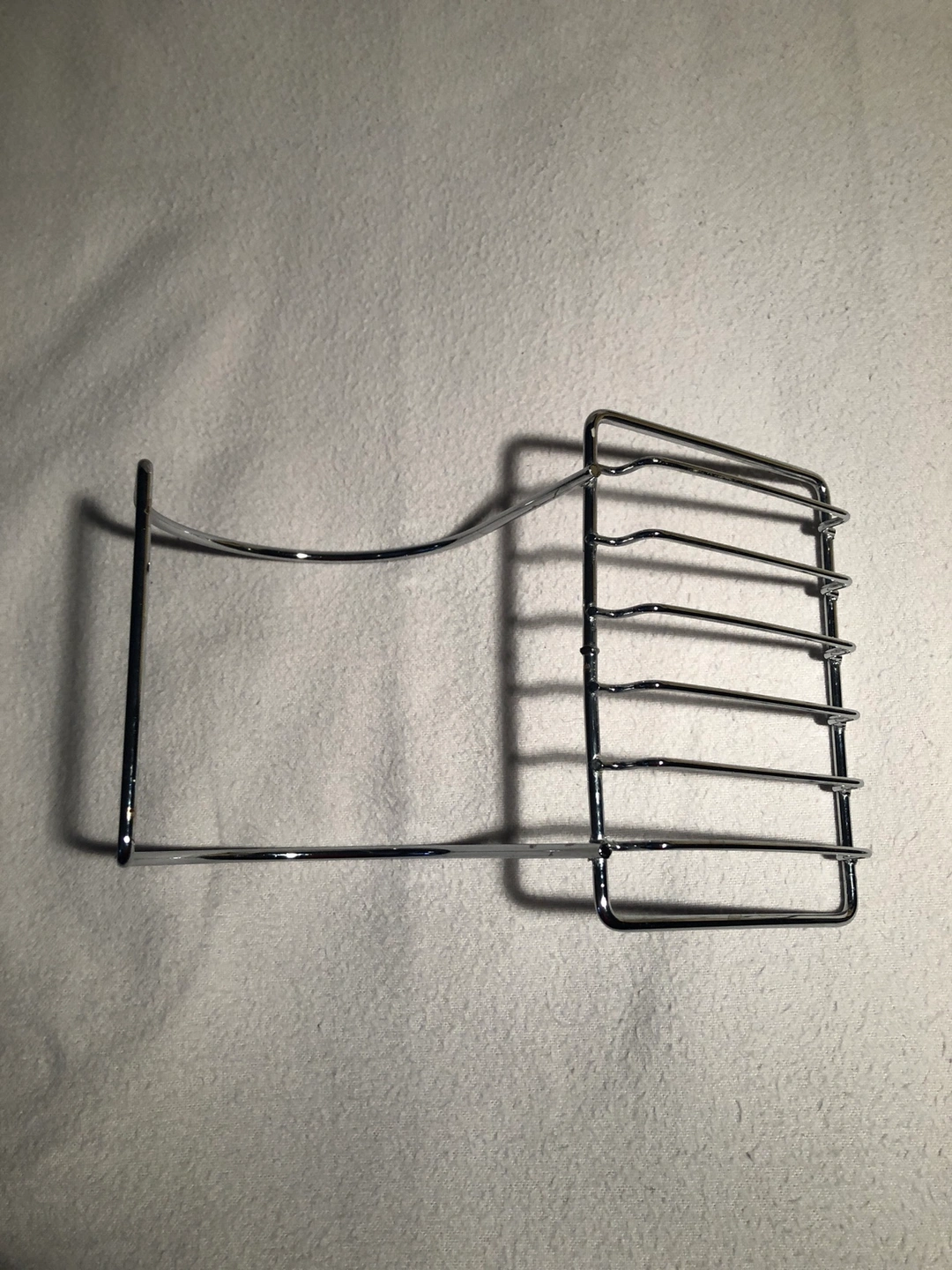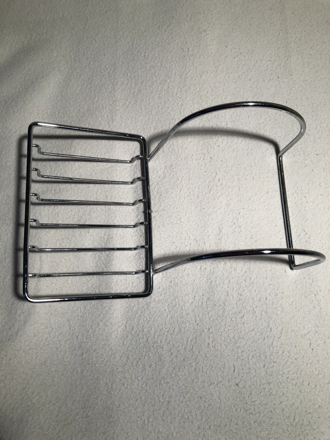 Chrome soap dish with hook to go over clawfoot tub rim.