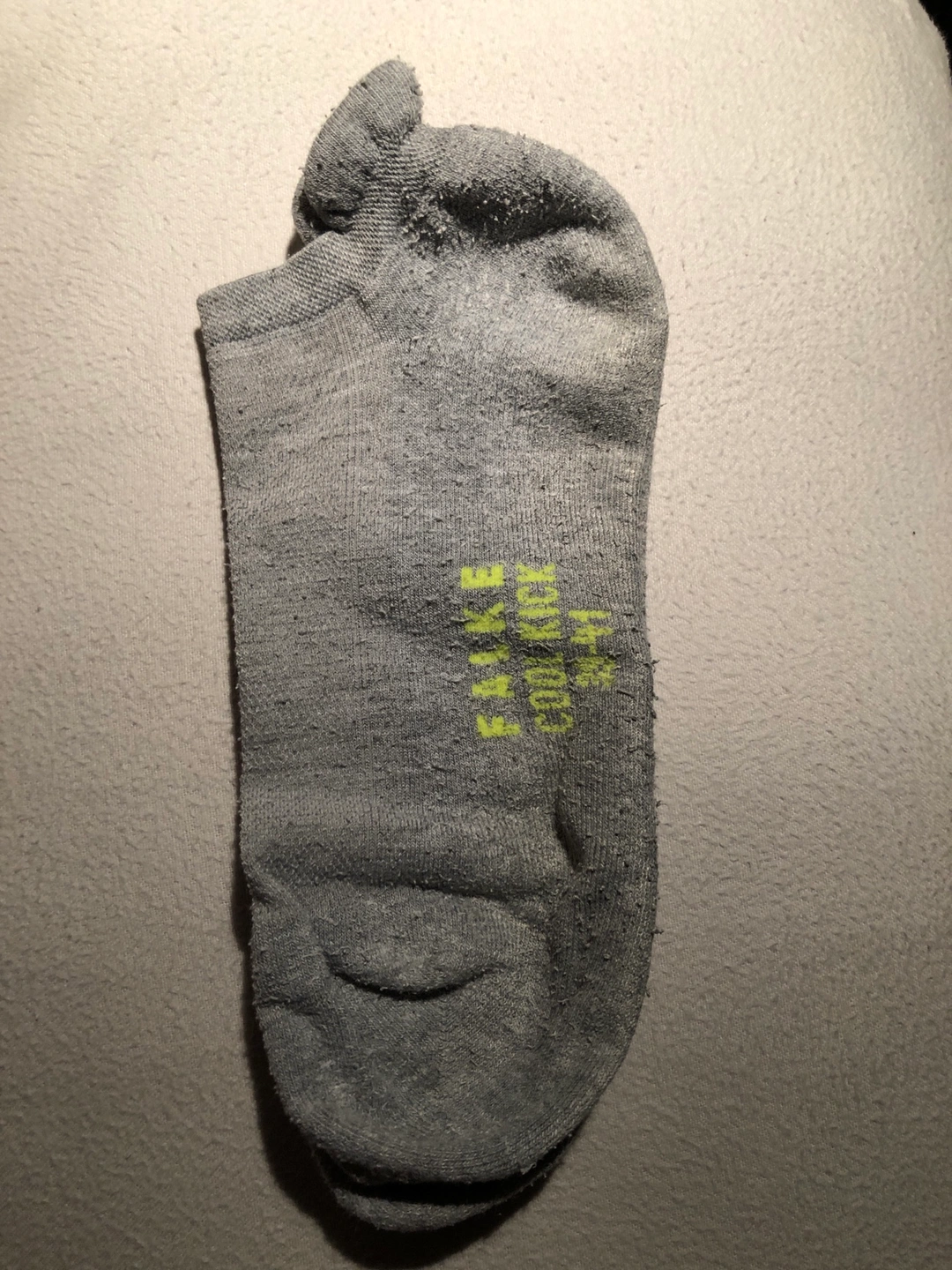 Pair of grey socks. Mesh tops. Very comfy. Polyester blend
