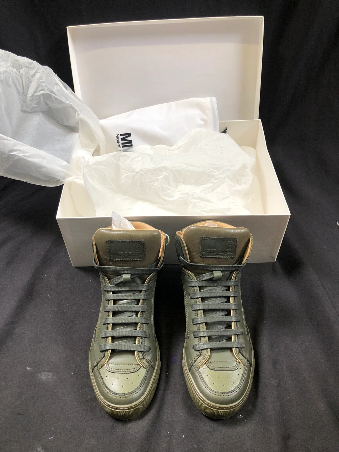New women’s size 6 Mason Margiela Green leather high-top sneakers. Comes with original box and dust bag $35 Pick up Victoria Park & O’Connor area