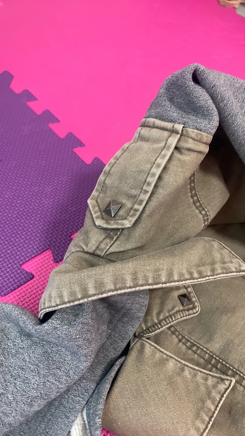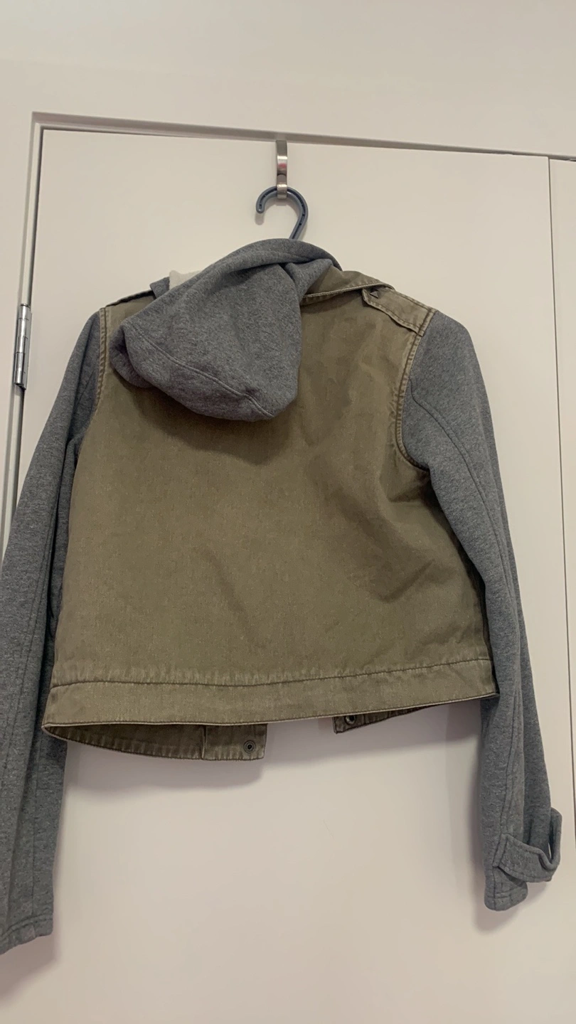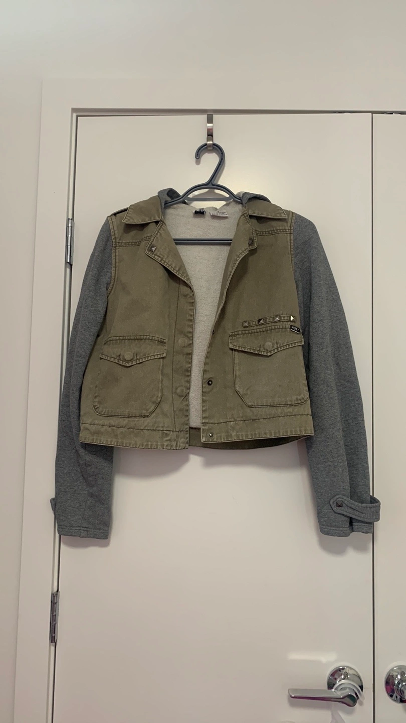 Green jacket with grey sleeves and a hood. Fleece lined. Pickup blundell or Richmond center