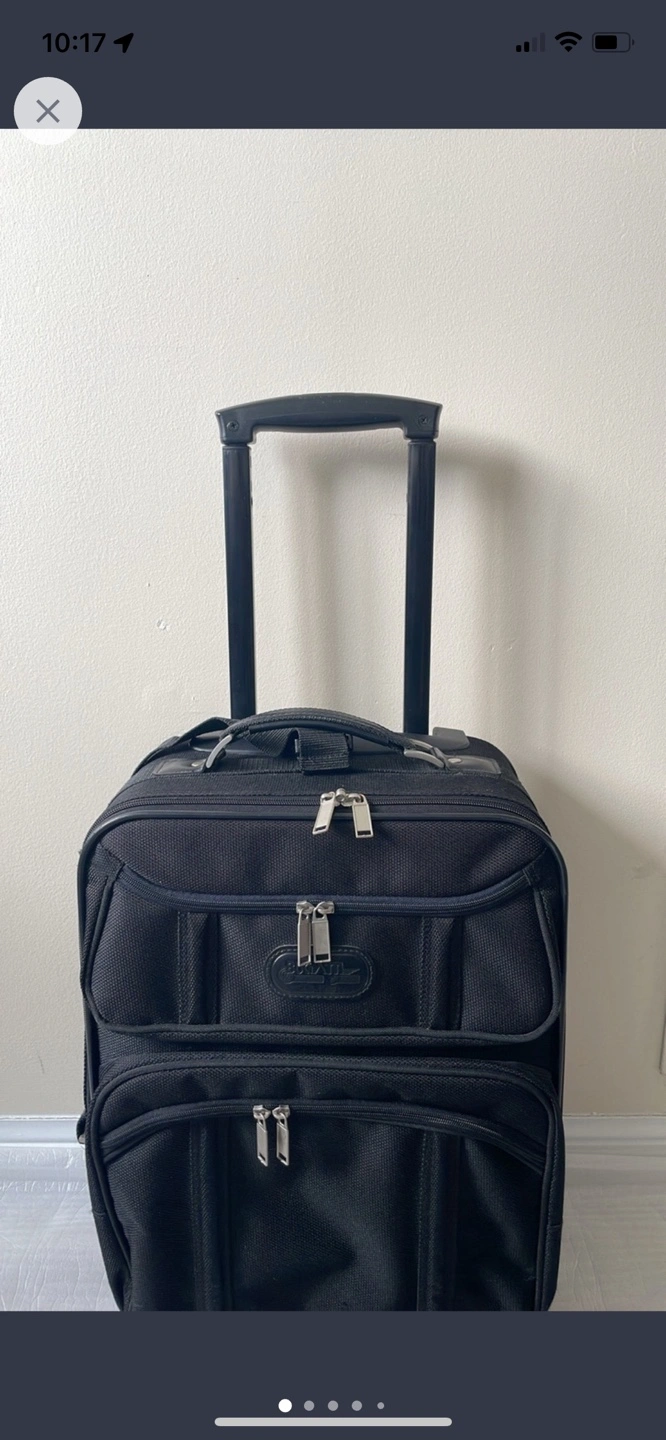 PICKUP LOCATION: Scarborough Town Centre Mall only (evenings) BUGATTI CARRY-ON LUGGAGE WITH WHEELS + RETRACTABLE HANDLE ***Excellent Quality from Bugatti that has served me well! ✅ ***I am selling it only due to downsizing! PRODUCT INFORMATION: BUGATTI brand is well-known for its craftsmanship and durability. The bag has been bought from the BAY store. ***Zippered closing ***2 wide zippered outer pockets ***Net zippered compartment inside the bag ***DIMENSIONS: Height: 18” (without the pull-out handle) Width: 13”/ Depth: 7” (All measurements approximately) ***All 4 zippers (3 outside, 1 inside) work fine! ***Wheels work great! ***Very durable and a good material bag PLEASE NOTE: •••The interior lining has been sprayed on as I had my full name written inside with a sharpie pen when in use during an overseas trip. •••However, the spray is completely dry and will not stain or stick to the contents of the bag!! 💼 In fact, I still use the bag occasionally. The only reason for selling is downsizing!! *OVERALL CONDITION: 8/10* The zippers, wheels and the bag material, all good!!! 👍👍