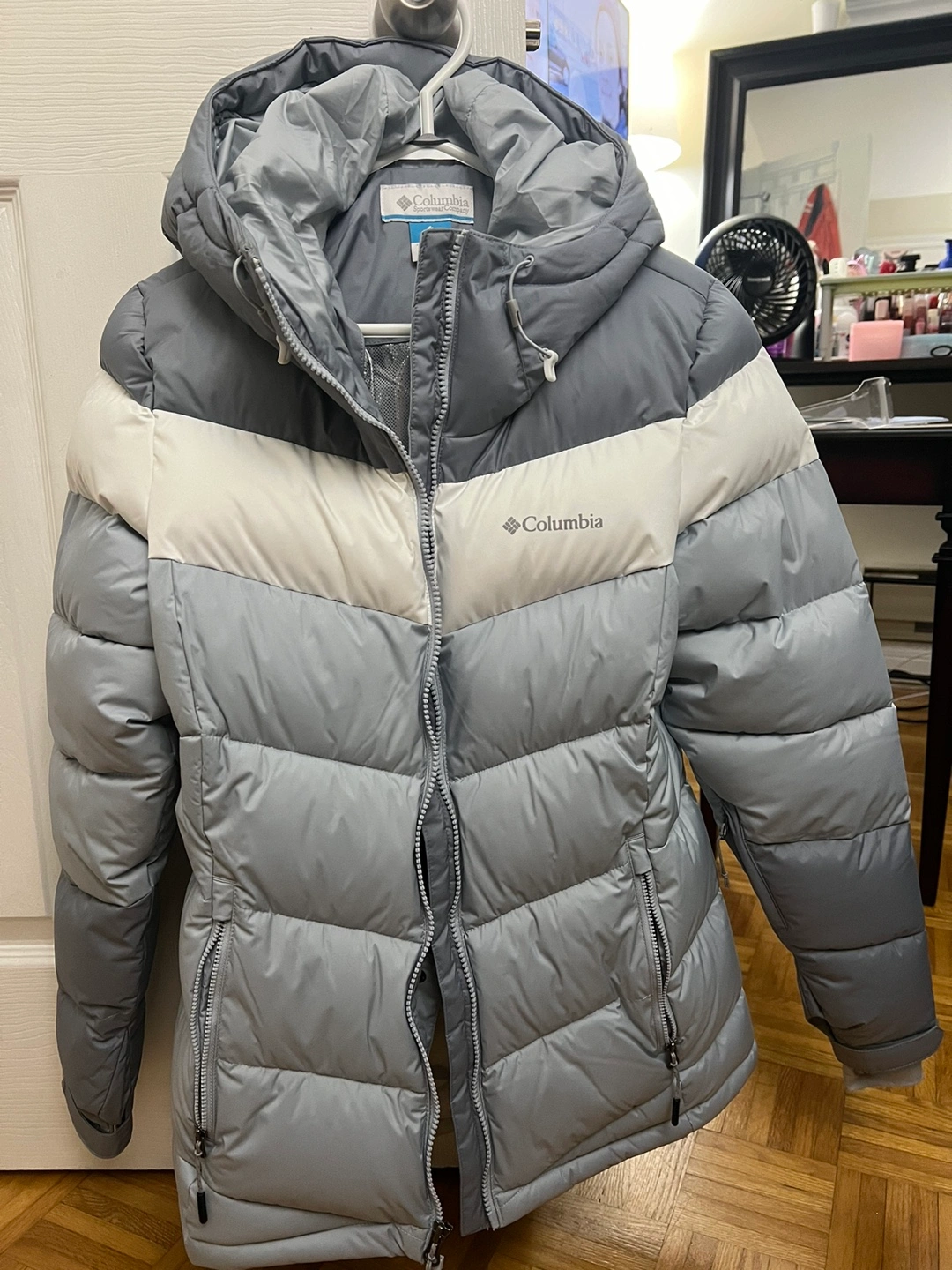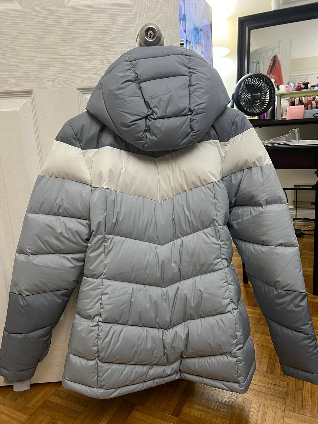 Grey and white puffer jacket. Features a hood and zipper closure.