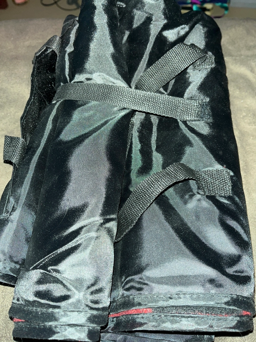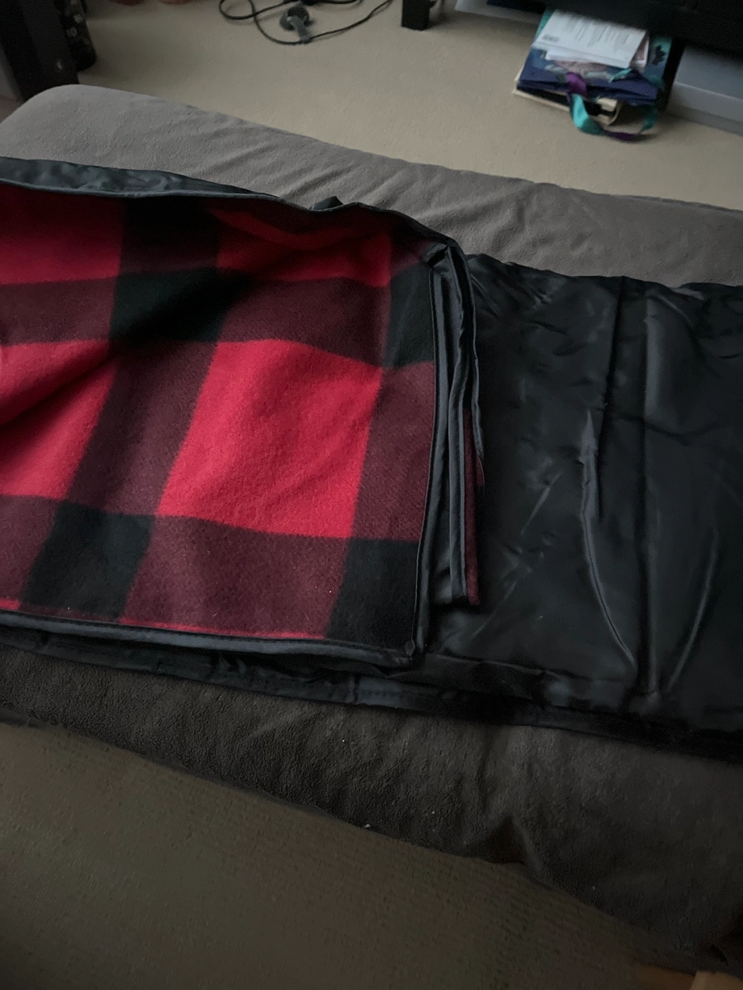 Black and red plaid blanket with a carrying bag. Brand new, never used. Size is like a twin / double bed size