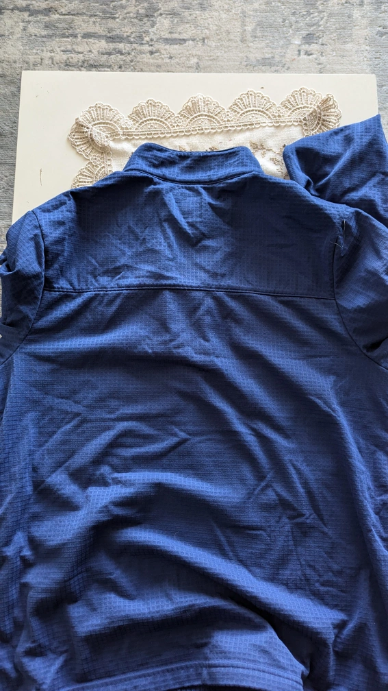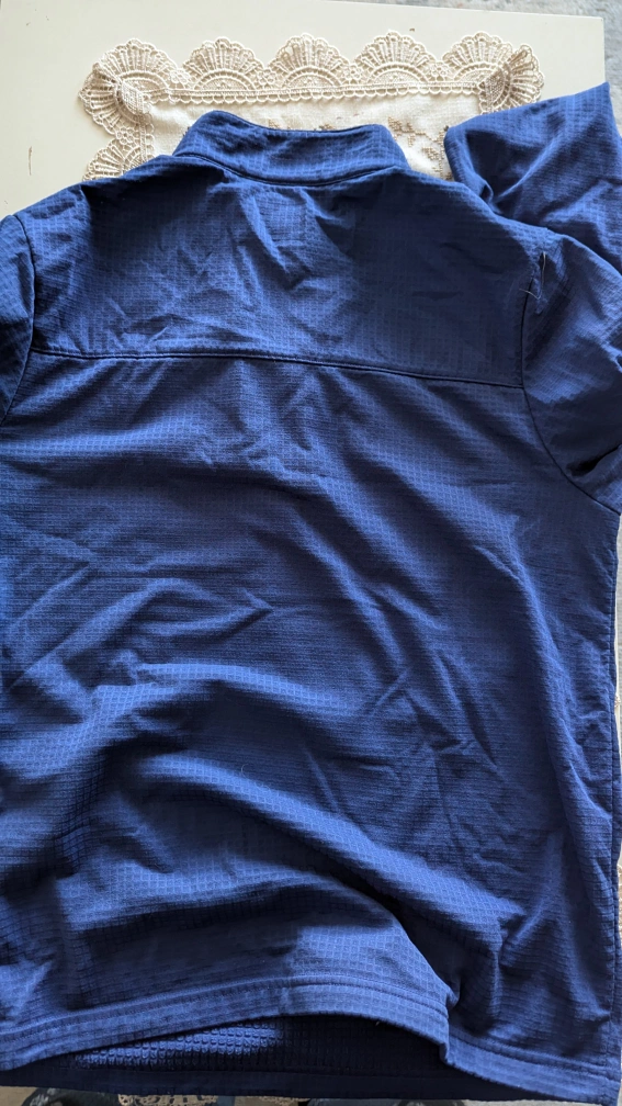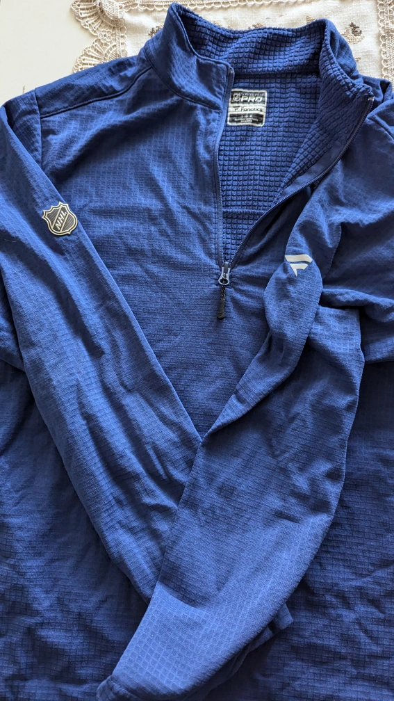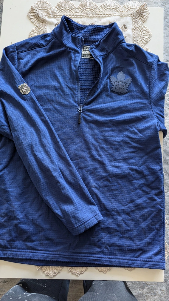 Blue 1/4 zip long sleeve shirt. Features the Toronto Maple Leafs logo and an NHL Authentic Pro tag used