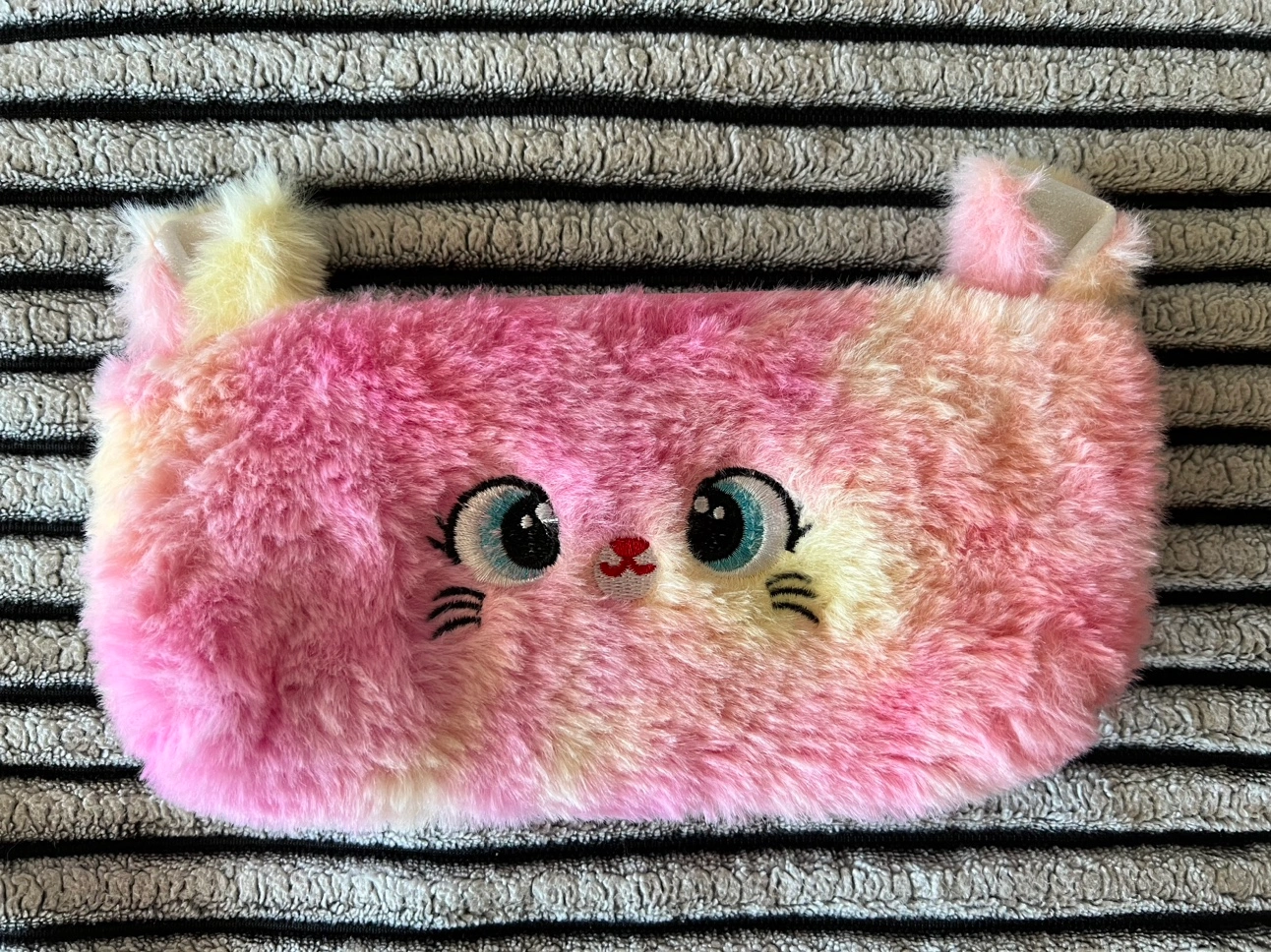 Fuzzy pink pencil case with cat ears and a cute embroidered face.