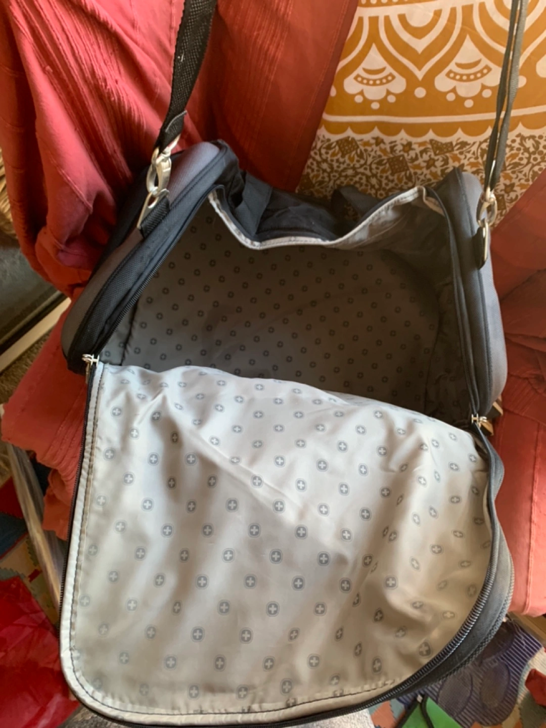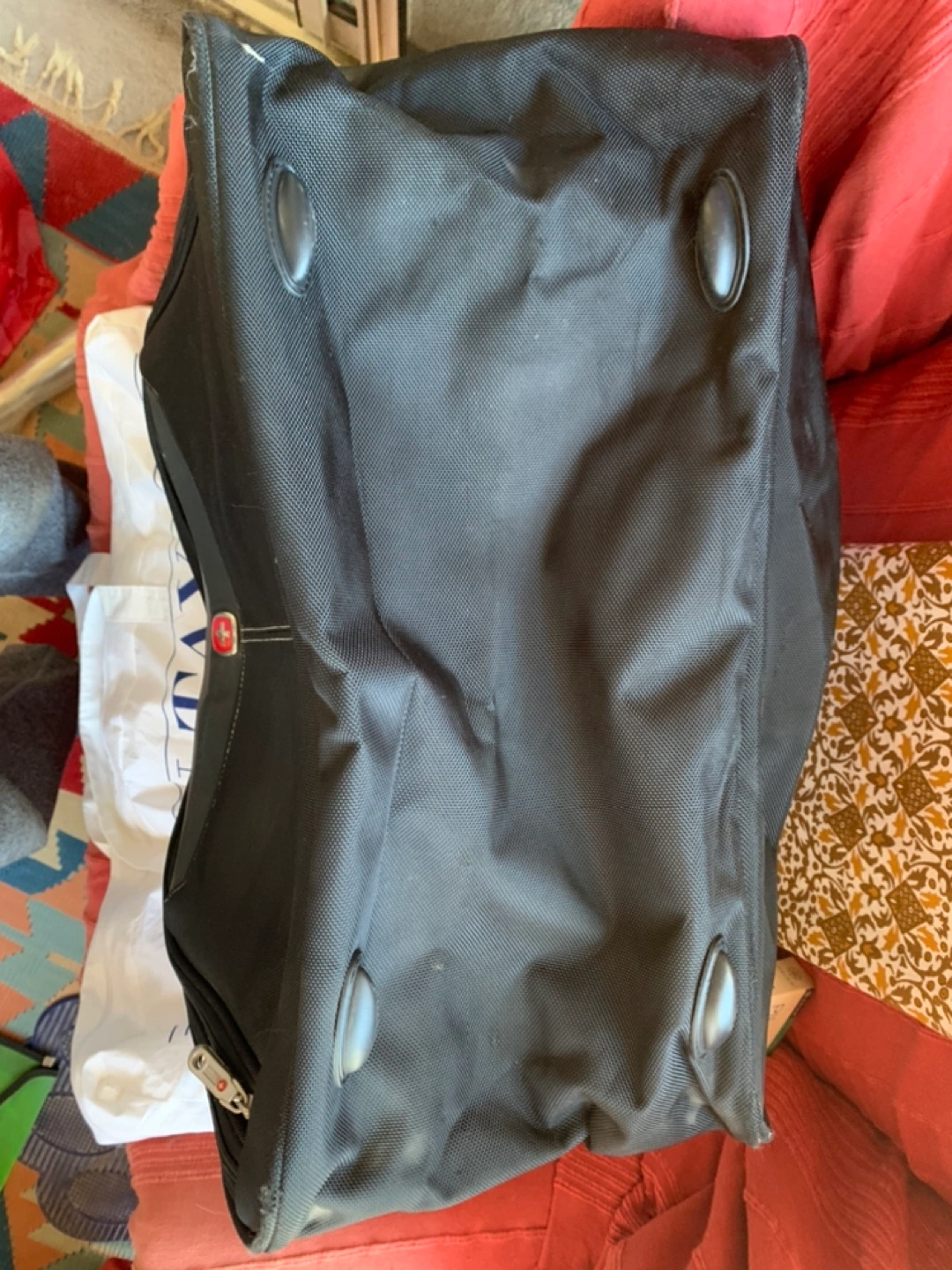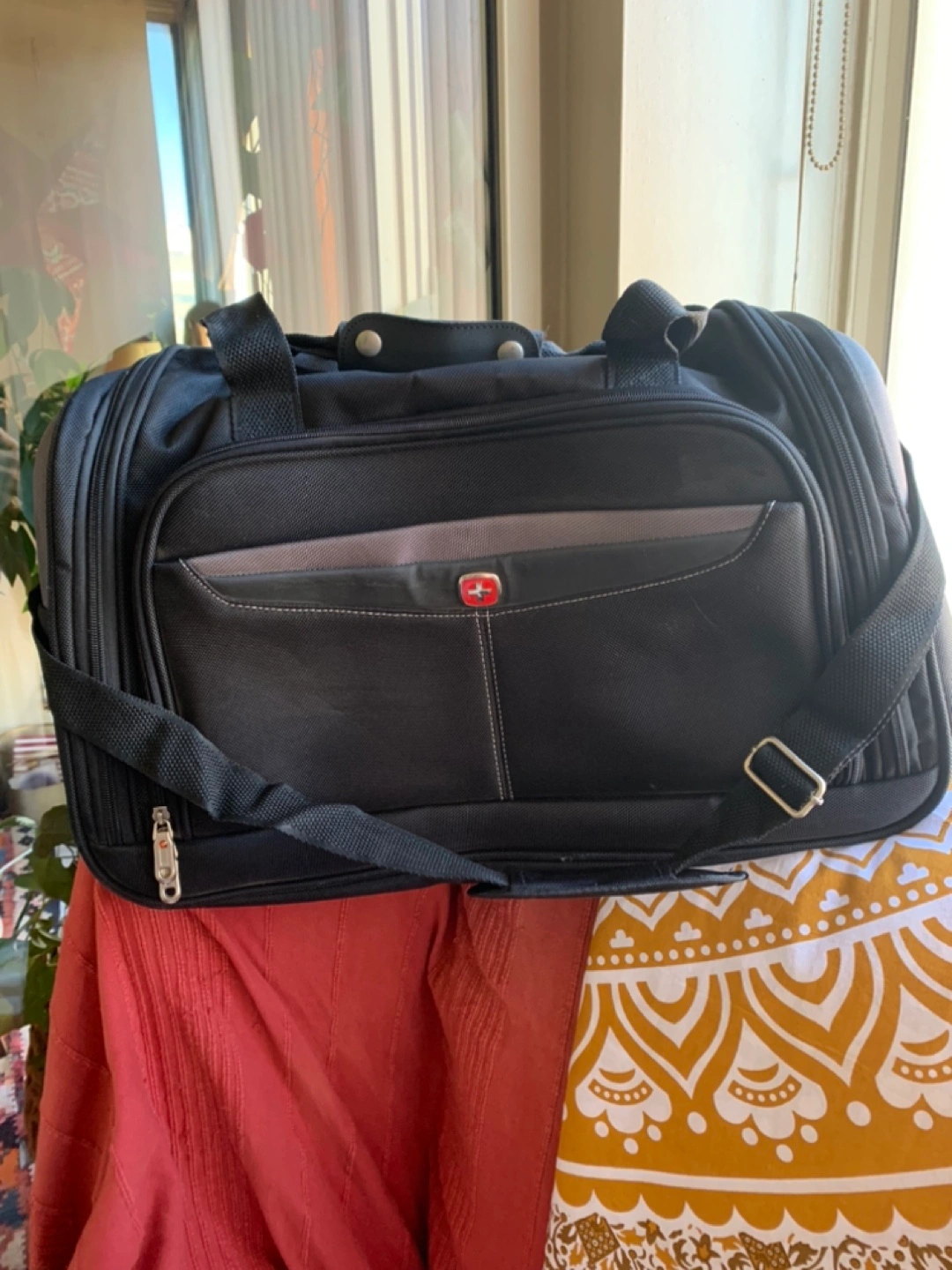 Black duffel bag with a shoulder strap. Includes a lock with key. Bought this back in 2010 and only used a few times. Minor scuffs. That can be cleaned. Please see photos. Great carry on bag for short trips or as a gym bag. Cash only.