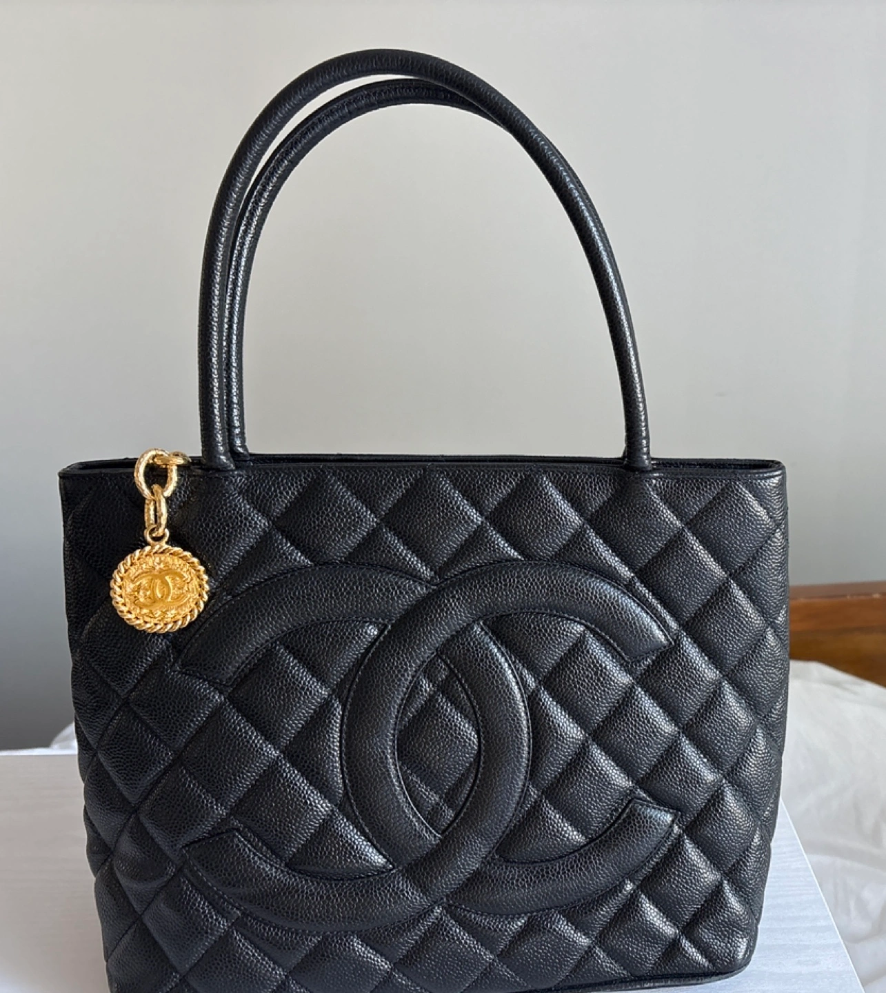 Black quilted leather tote bag with gold chain and hardware. Features a CC logo on the front and a zipper closure. Comes with a dust bag.