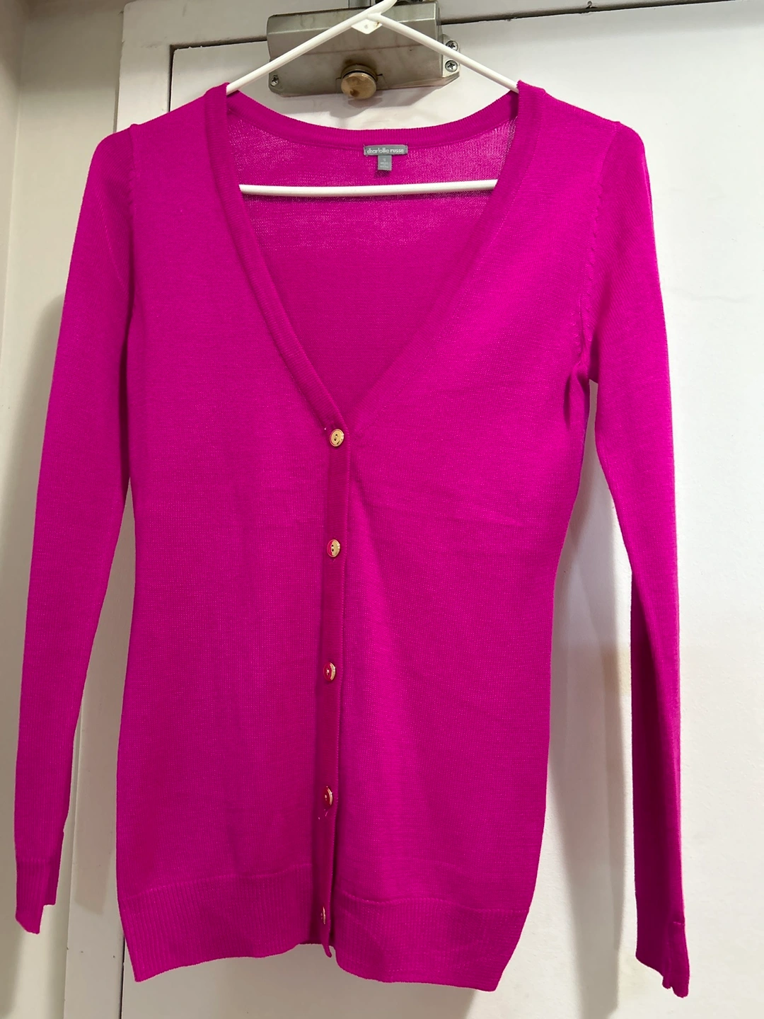 Long sleeve cardigan with V-neck and gold buttons. Lightweight and soft. Pick up only
