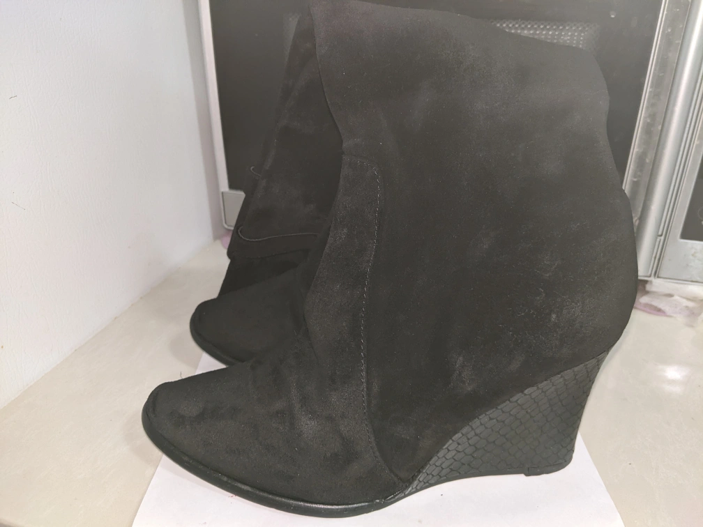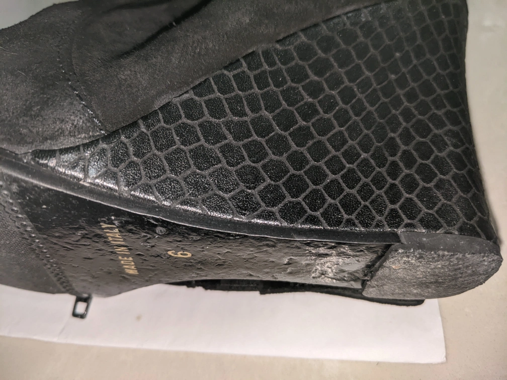 Black suede wedge boots with a zipper on the inside of the leg and a buckle detail on the outside of the leg. Made in Italy. Size 6. Serious Inquiries only No delivery