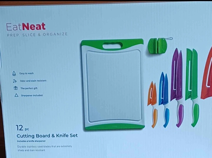 12 piece set includes 5 assorted kitchen knives, 5 matching knife sheaths, 1 non-slip cutting board, and 1 knife sharpener. Durable stainless steel blades that are extremely sharp and stain resistant. Location Eastmall and Rathburn