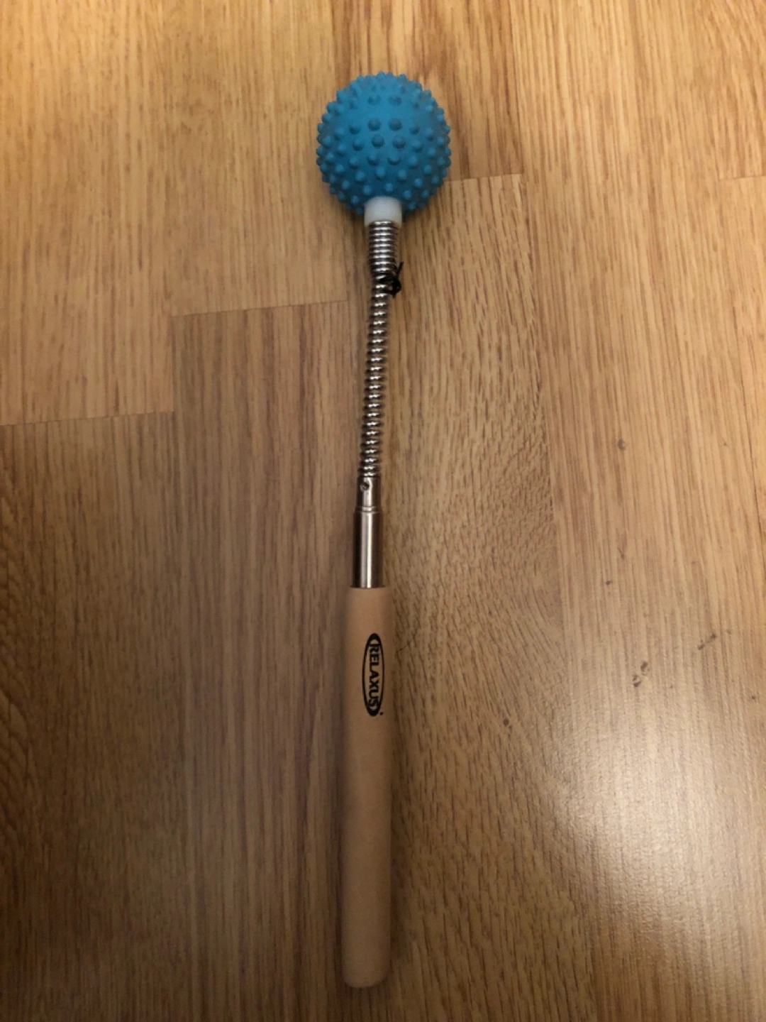Blue spiky ball on a spring-loaded handle. Wooden handle with Relaxur branding.