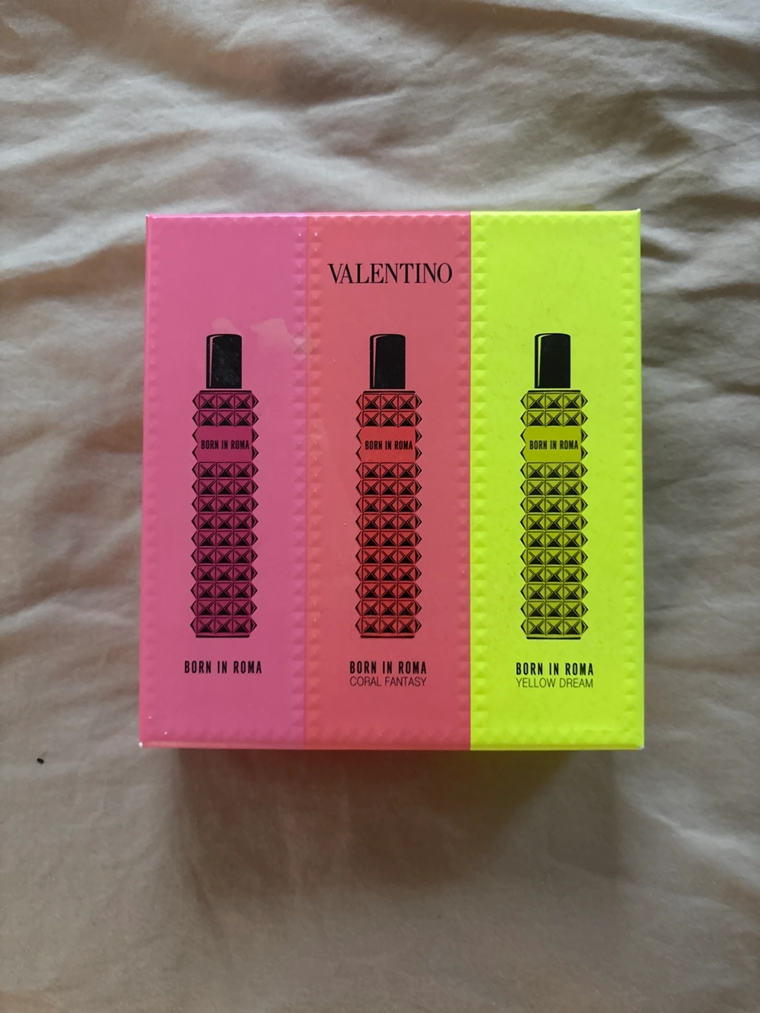 Three-piece set of Valentino Born in Roma perfume. Includes Born in Roma, Coral Fantasy, and Yellow Dream scents.