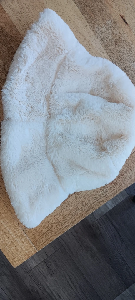 White faux fur bucket hat with a black drawstring. I never wore it. it doesn't suit me